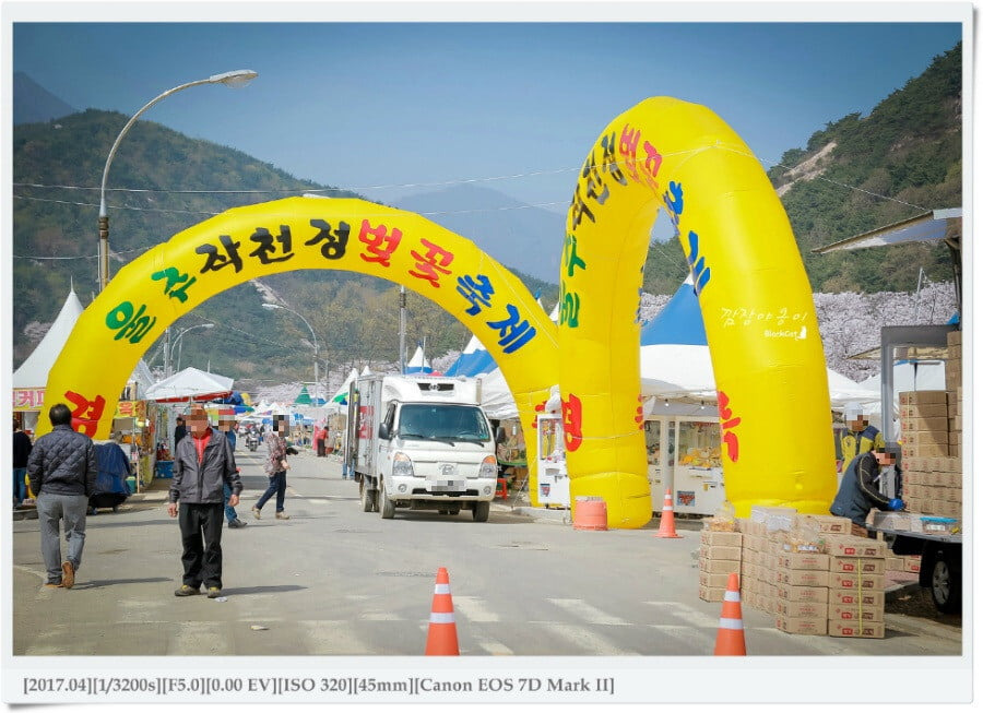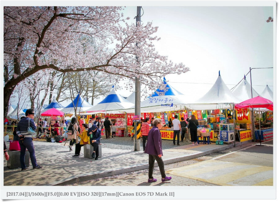 벚꽃길의 시작을 알리는 "풍선문"을 지나면 한쪽에는 먹거리를 위한 상점들이 즐비하고 다른 한쪽은 벚꽃나무가 줄지어 벚꽃길을 이루고 있답니다.