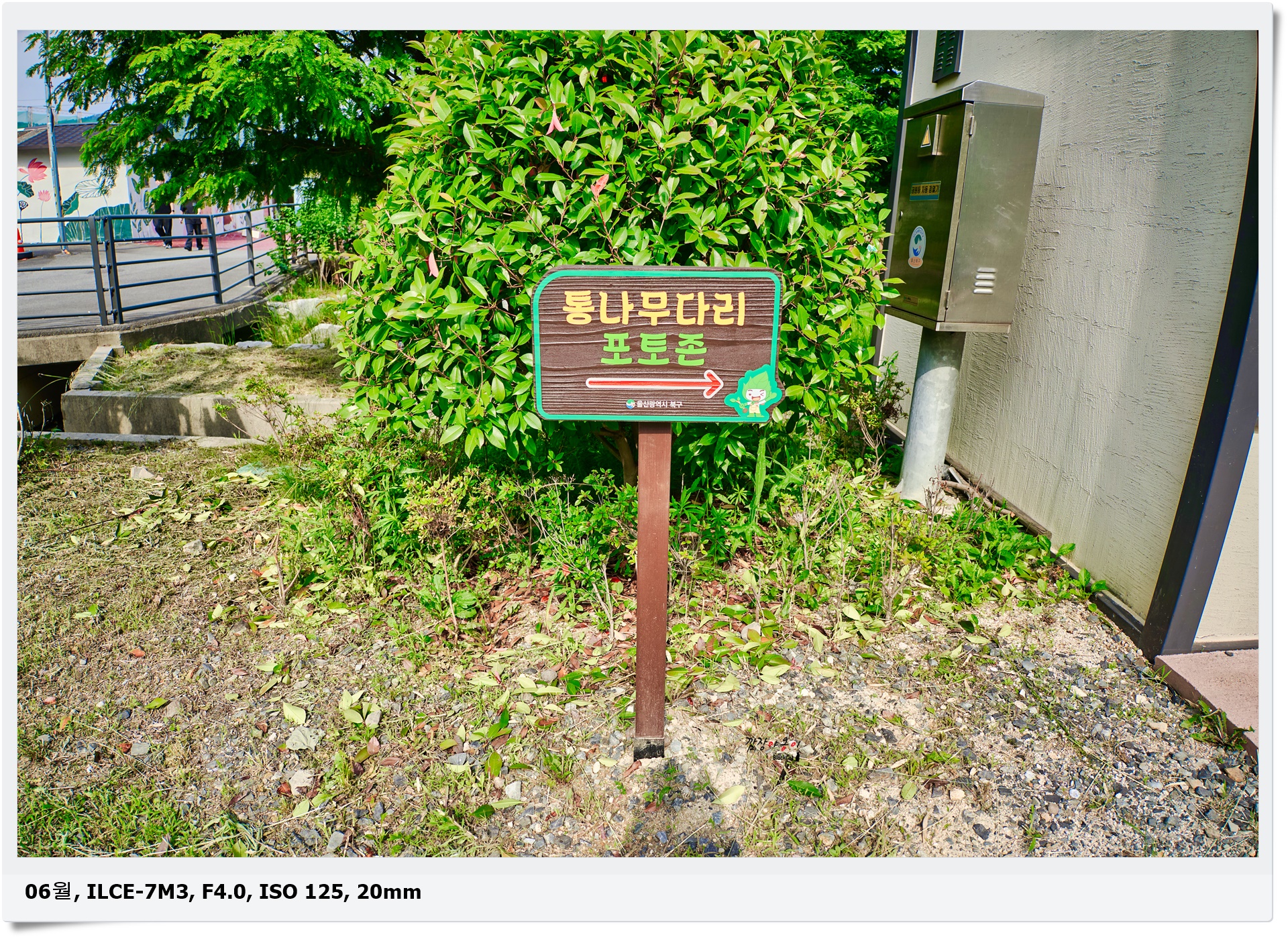 화장실 앞에 보면 통나무다리 포토존 이정표가 있는데요. 주차장 입구에 화장실이 있고 주차장 중간쯤에 보면 통나무다리가 있는데 주차하면 바로 앞이랍니다.