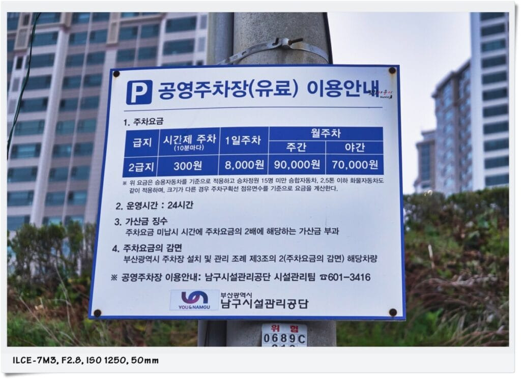 오륙도 해맞이공원 바로 앞에 있는 공영주차장에 주차를 했는데 2급지로 10분당 300원의 요금이 부과되며 남구시설공단에서 관리를 하고 있습니다.