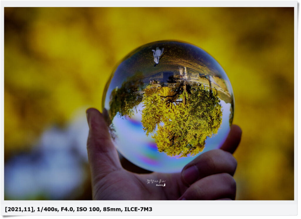 오늘도 가지고 간 일명 여의주!! 촬영용 구슬을 이용해 노랗게 물든 은행나무의 전경을 담아 봤는데 색다른 모습을 찍을 수 있어서 잼있긴한데 생각보다 구슬이 무거워서 ㅋㅋ