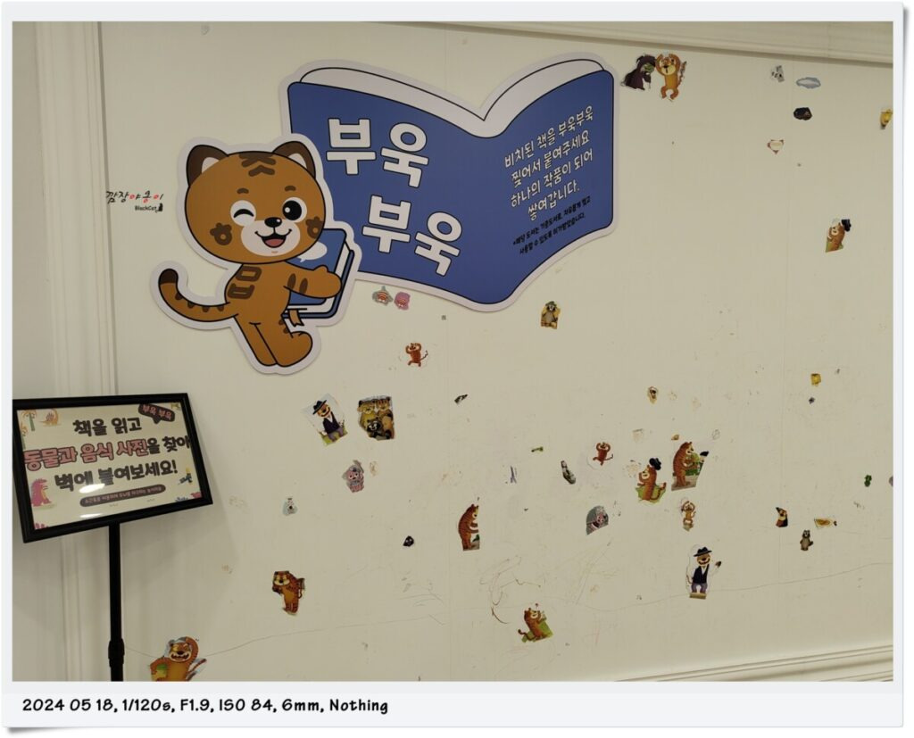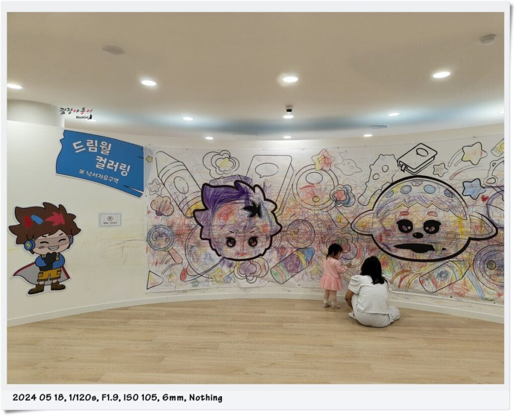 캐릭터 도안 위로 자유럽게 색칠할 수 있는 벽 드림월 컬러링, 벽과 유리에 크레용과 사인펜을 이용해 자유롭게 그릴 수 있는 드림캔버스, 책을 보고 뜯고 읽고 낙서할 수 있는 부욱부욱 등 아이들이 낙서하고 그림그릴 수 있는 공간이 2층에 마련되어 있습니다.