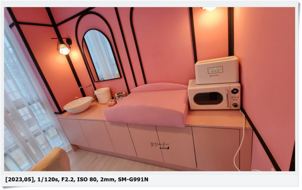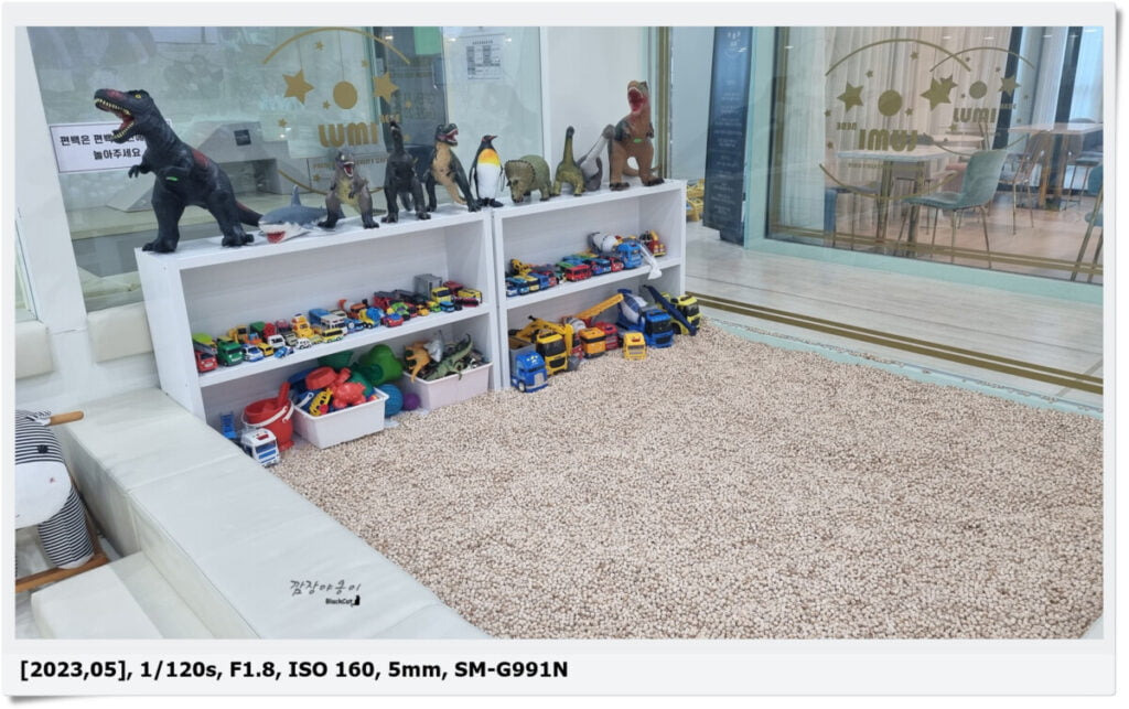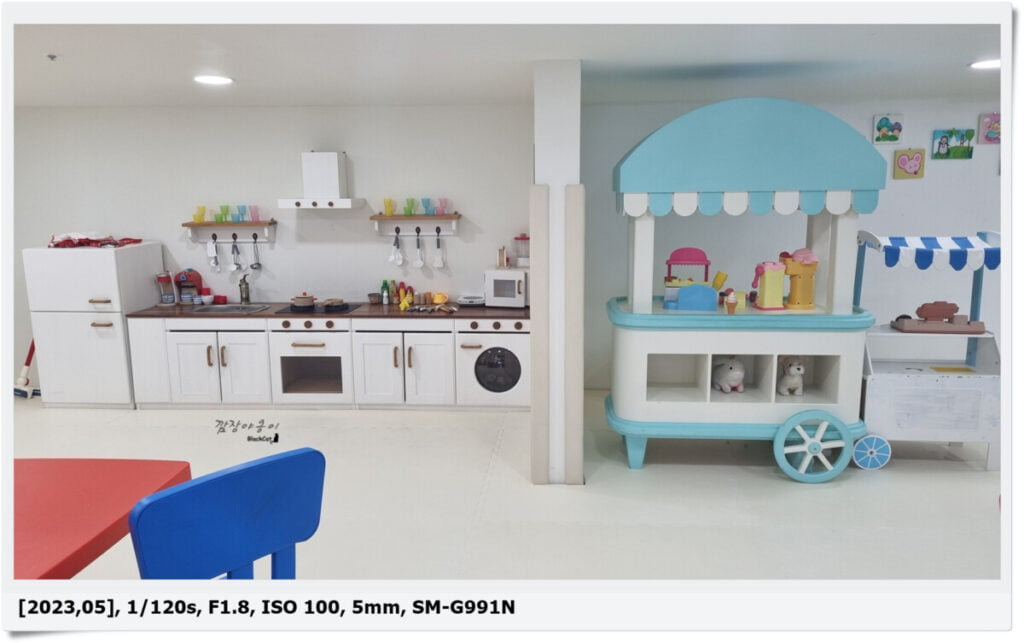 데스크를 기준으로 왼편에는 부모들의 마른 목과 굶주린 배를 채울 수 있도록 테이블이 마련되어 있으며 아직 걷지 못하는 아기들을 위한 놀이기구와 이유식/ 우유를 데울 수 있는 전자렌지, 기저귀를 갈 수 있는 공간이 마련되어 있습니다.
