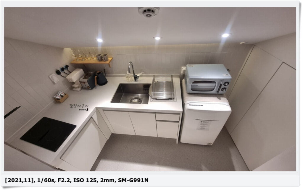 거실도 조그만 계단 형태로 티타임을 즐길 수 있게 되어 있어 커피 한 잔 하며 피곤을 풀고 담소를 나눌 수 있게끔 되어 있네요. 통창으로 밖도 볼 수 있어 힐링하기 굳! 일리 커피 머신과 캡슐도 있으니 꼭 한 잔 해 보시길~