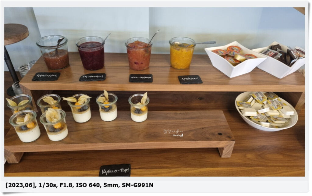 호캉스하면 역시 조식이죠!! 캠브리안 느낌답게 조식 코너도 아담하지만 알찼답니다. 베이커리류부터 요거트, 착즙 쥬스, 에그류, 잼류, 치즈류, 햄류, 채소류, 과일류까지 정말 알차게 다 있네요. 역시 치즈는 종류도 다양하고 고급지네요. 스위스긴 한가봐요. 유럽은 역시 과일도 맛있고 과일쥬스도 진짜 맛있네요.