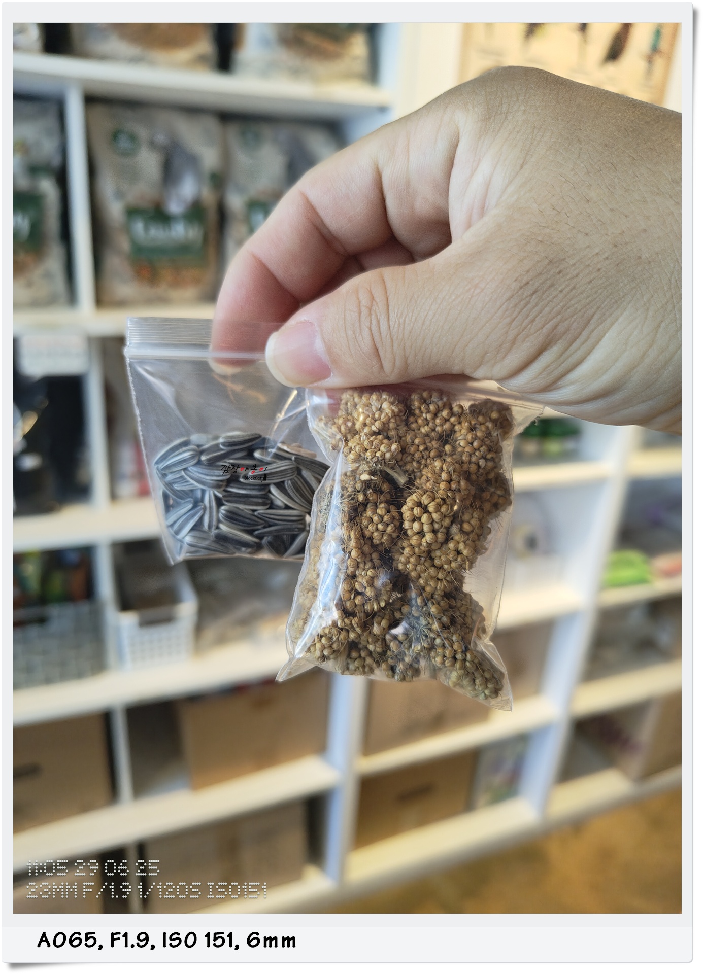 햇살이가 동물 먹이 주는 걸 좋아해서 앵무새 모이도 하나 주문을 했네요. 뒤쪽의 해바라기씨는 큰 앵무새, 앞쪽의 콩알은 작은 앵무새를 위한 모이입니다.