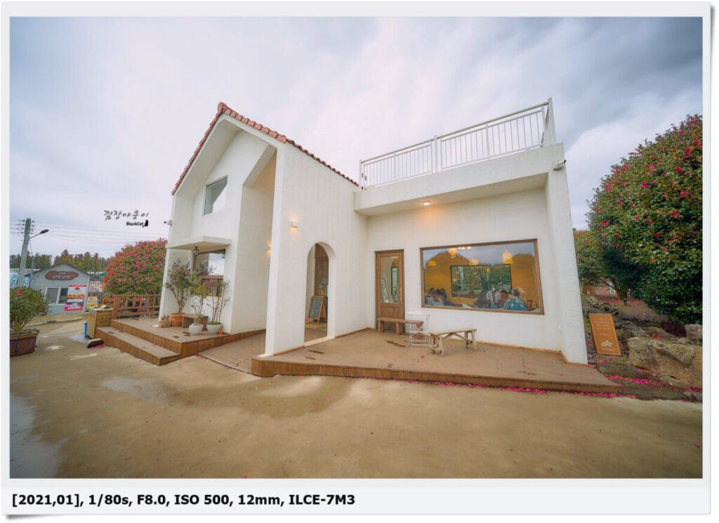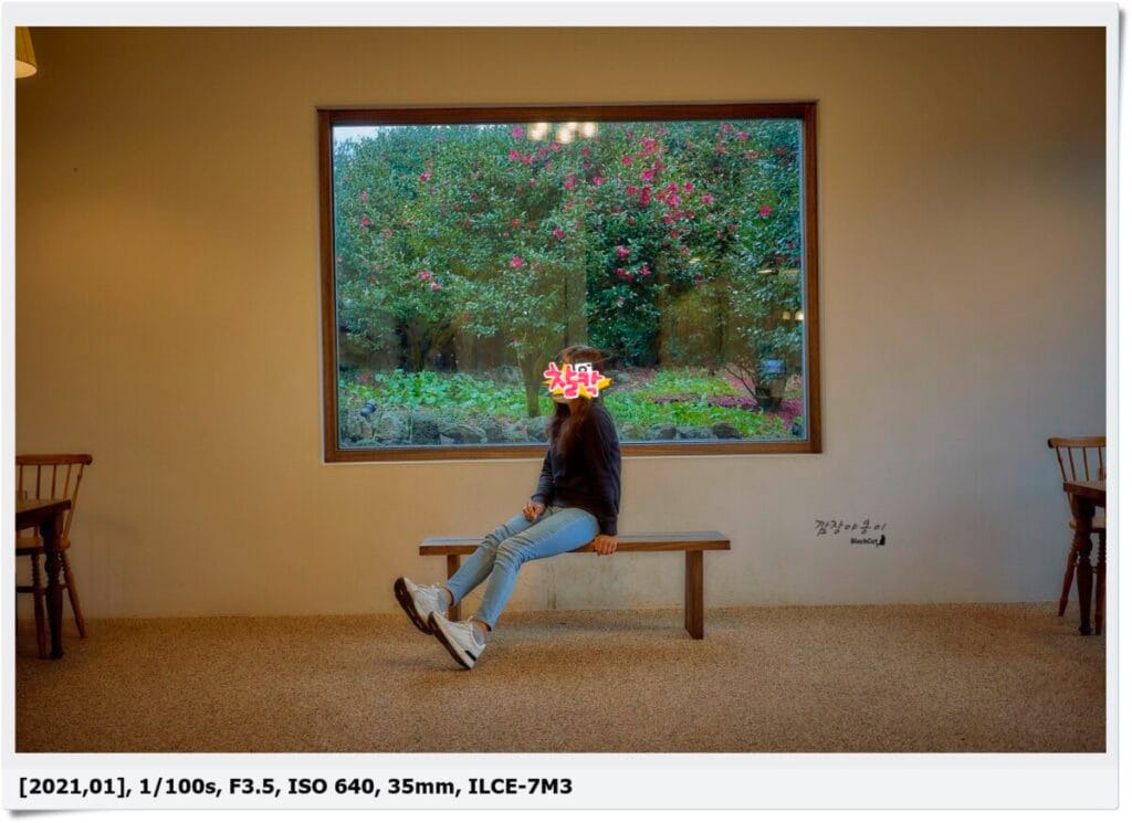 사진 스팟은 총 3가지로 나뉘는데요. 한가지는 외부 정원에 심어져 있는 동백나무에서 촬영하는 것, 또 한가지는 카페내부에서 창문을 통해 밖의 동백나무가 보이는 액자같은 모습, 그리고 마지막 한가지는 카페의 2층 테라스로 나가서 정원을 바라보며 찍는건데요.