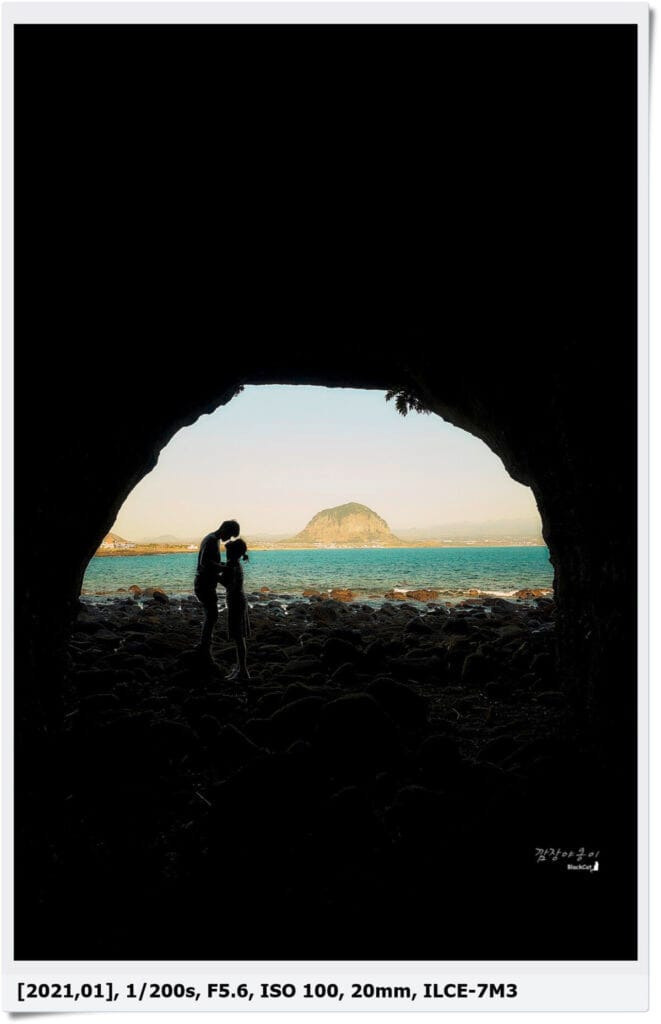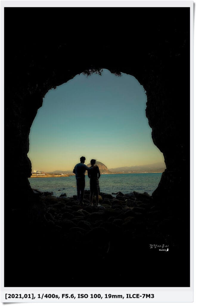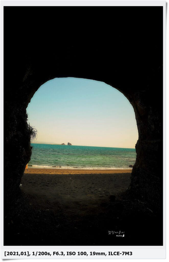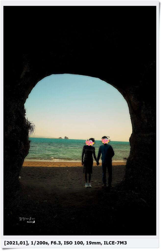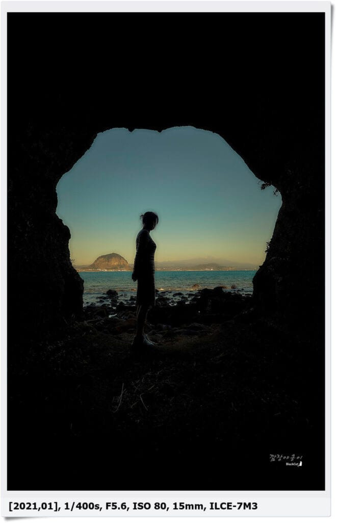 네번째 D동굴에서 찍은 사진입니다. 앞서 찍은 사진들과 마찬가지로 뒤로 용머리가 보이는데요. 대부분 해안절벽 동굴에서 찍은 사진들은 이렇게 용머리 아니면 형제섬이 배경으로 나온답니다.