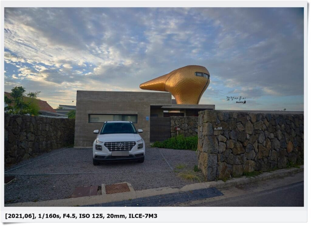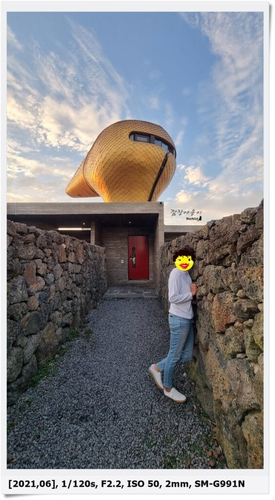 밖에서 바라보는 우주오리의 오리동은 제주도의 상징인 돌담 뒤로 사이버틱한 오리의 뒤통수가 보이는데요. 뒤통수에 유리창들이 있는 모습이 딱 봐도 저길 올라갈 수 있겠구나… 하는 생각이 드네요.