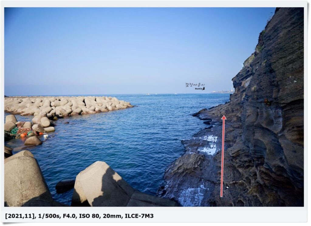 포구에 보시면 흰색등대와 빨간색 등대가 있을텐데 흰색등대가 있는 방파재 옆으로 올래길 12코스 아래로 지나가는 절벽이 있고 물이 빠지면 사람이 밟을 수 있게 돌길이 만들어 지는데요.