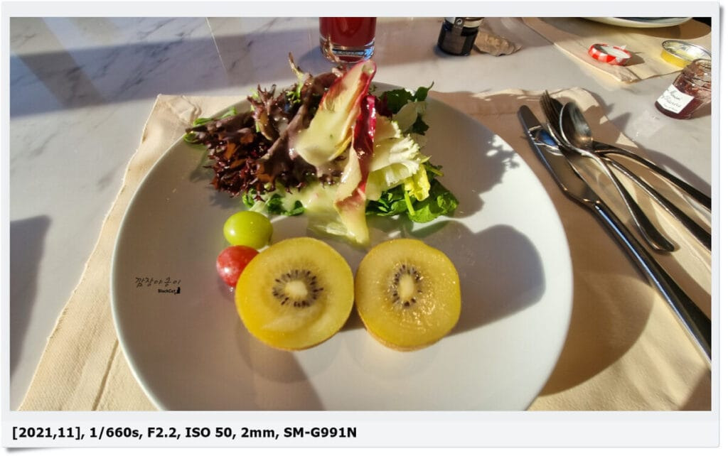 두번째 판~~ 빵과 수프 그리고 과일과 샐러드입니다~ 수프도 고소하니 괜찮네요. 골드키위는 인기가 많은 지 다들 잔뜩 퍼 가시네요. 저렴이로 배 채우면 안된다면서 계속 식빵을 구워 오는 와이프 ㅎㅎ