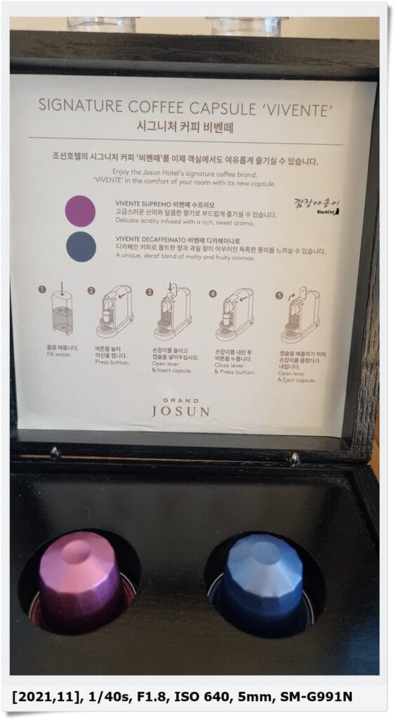 산모들은 카페인 되도록 먹지말라고 해서 임신후엔 항상 디카페인만 마셨는데 그동안 다른 호텔, 팬션 등에 들렀을 때도 커피는 준비되어 있었지만 디카페인이 없어 못 마셨었는데 5성급 특급호텔이라 그런가 세세함이 다르긴 하네요 ㅎㅎ