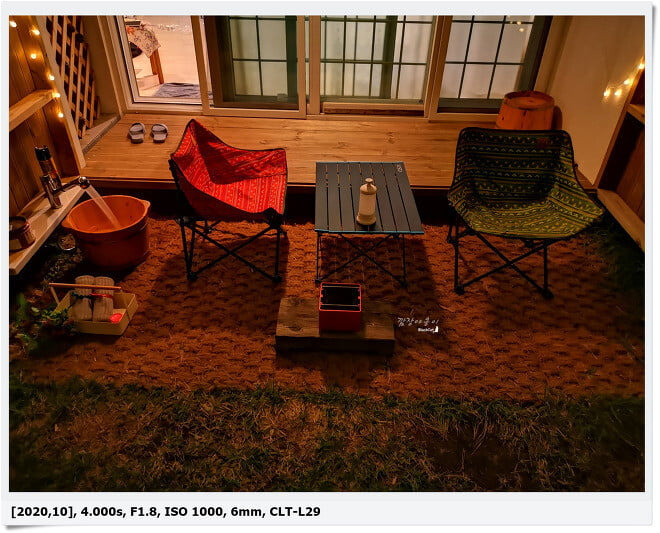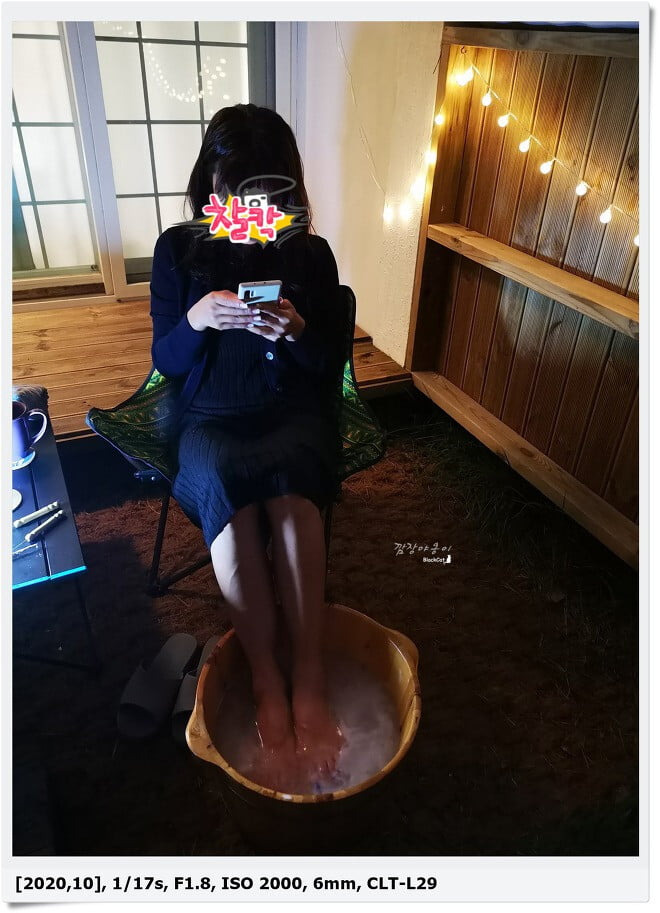 베란다 문을 열면 텐트 내부 같은 개인 공간이 나오는데요. 이곳에 수전이 하나 있답니다. 그곳에서 뜨거운 물을 받아 아로마인가 족욕제용 가루를 넣어 족욕을 할 수 있는데요.