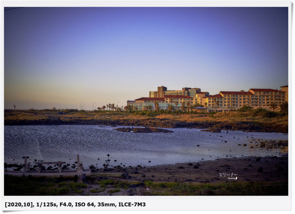해안가 옆에 당케포구라고 등대가 있고 그 뒤쪽으로 용암이 굳어서 생긴 현무암지대가 있는데요. 이곳도 중간에 길이 나 있어 사람들이 들어갈 수 있도록 되어 있습니다. 저희가 촬영한 지역에서 왼쪽으로는 당케포구가 보이고 오른쪽으로는 해비치호텔앤드리조트 마고가 보이네요.