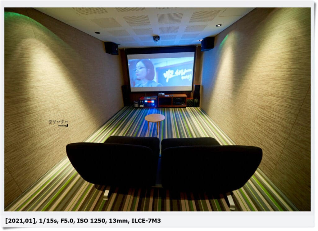 내부에는 방음이 되어 있는 실이 하나 있는데요. 이곳에는 빔프로젝트가 설치되어 있고 이곳에서 DVD영화관람이나 노래방 기능을 사용하실 수 있습니다.