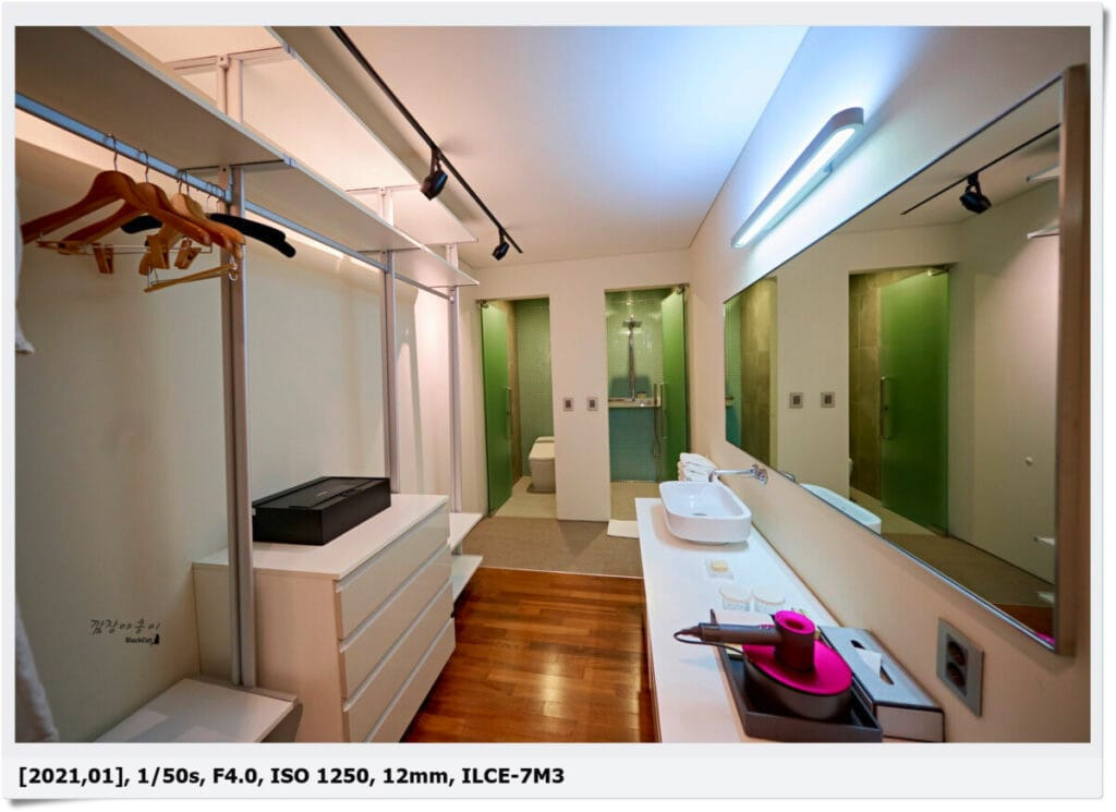 안방의 안쪽인데요. 앞서 이야기 했듯이 1개의 샤워부스, 1개의 화장실 그리고 옷걸이와 사진엔 안보이지만 왼쪽에 작은 금고도 있습니다.