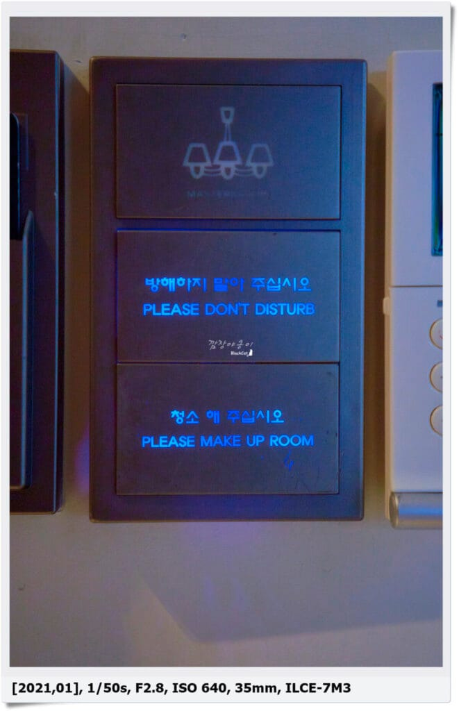 방을 비울때 따로 프론트에 전화를 하지 않고 현관 앞에 있는 버튼을 이용하면 내부청소를 해주시거나 방해를 하지 않는데요.
