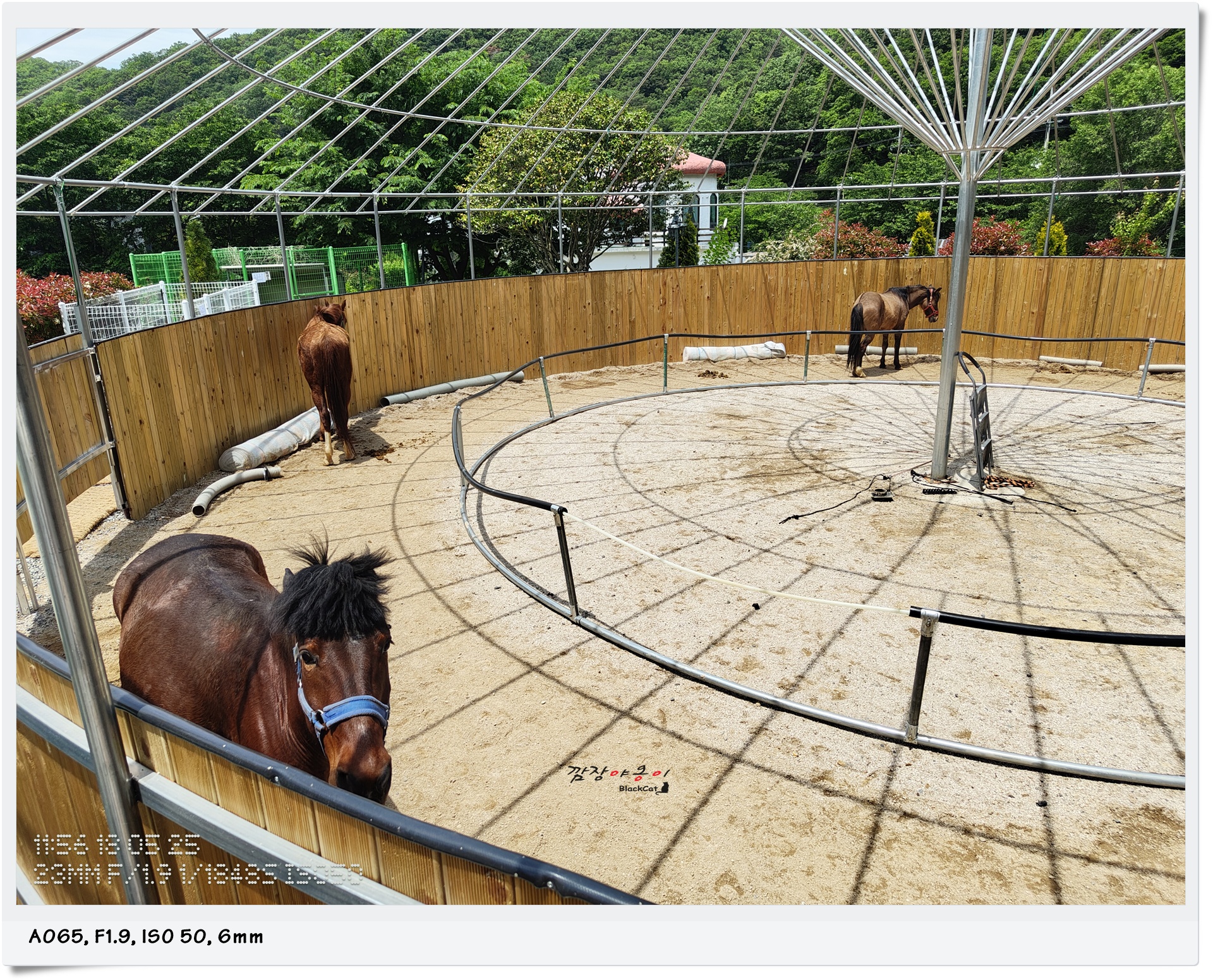 큰 말들이 사는 사육장입니다. 5월임에도 불구하고 햇볕아래는 한여름 만큼이나 뜨거운데요. 당근을 든 아이들이 보이니 말들이 하나 둘 앞쪽으로 모여 당근을 달라고 앞발로 바닥을 긁네요.