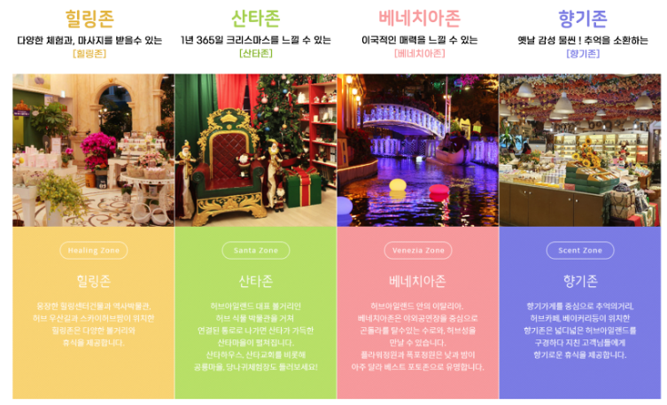 4개의 존, 4개의 테마를 가지고 있는 허브아일랜드의 관람도입니다. 미리 가볼곳을 체크해두고 동선을 짜둔다면 조금 더 효율적인 관람을 할 수 있을 듯 싶네요.