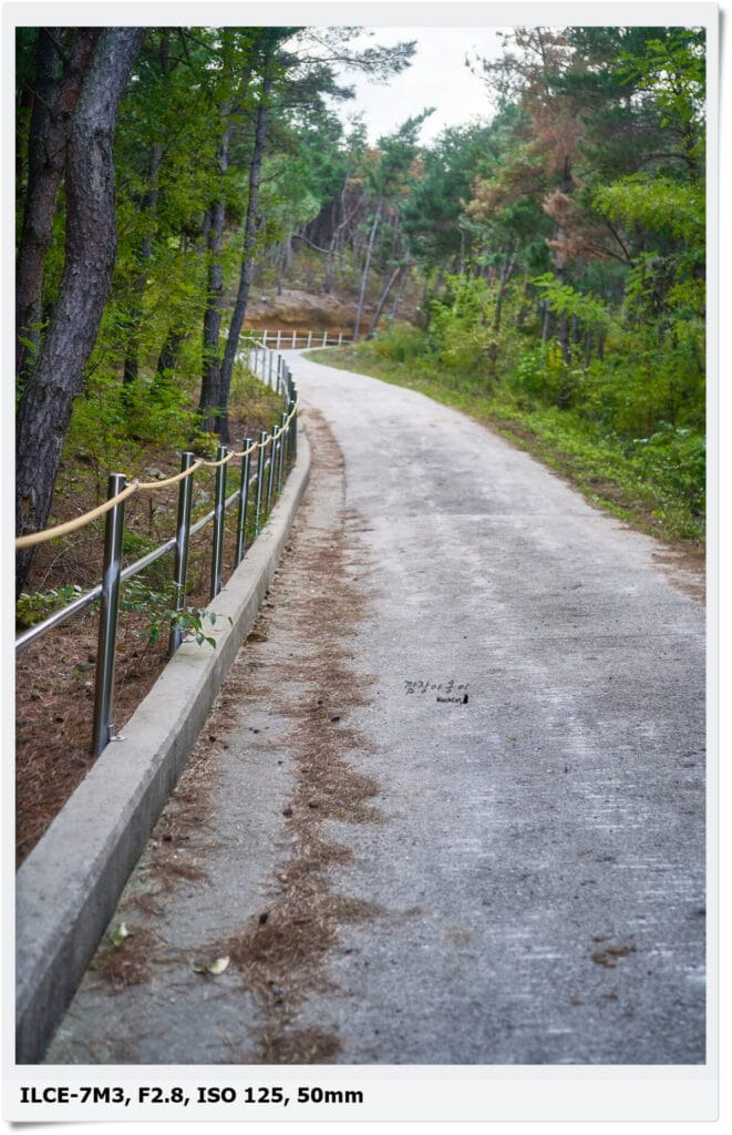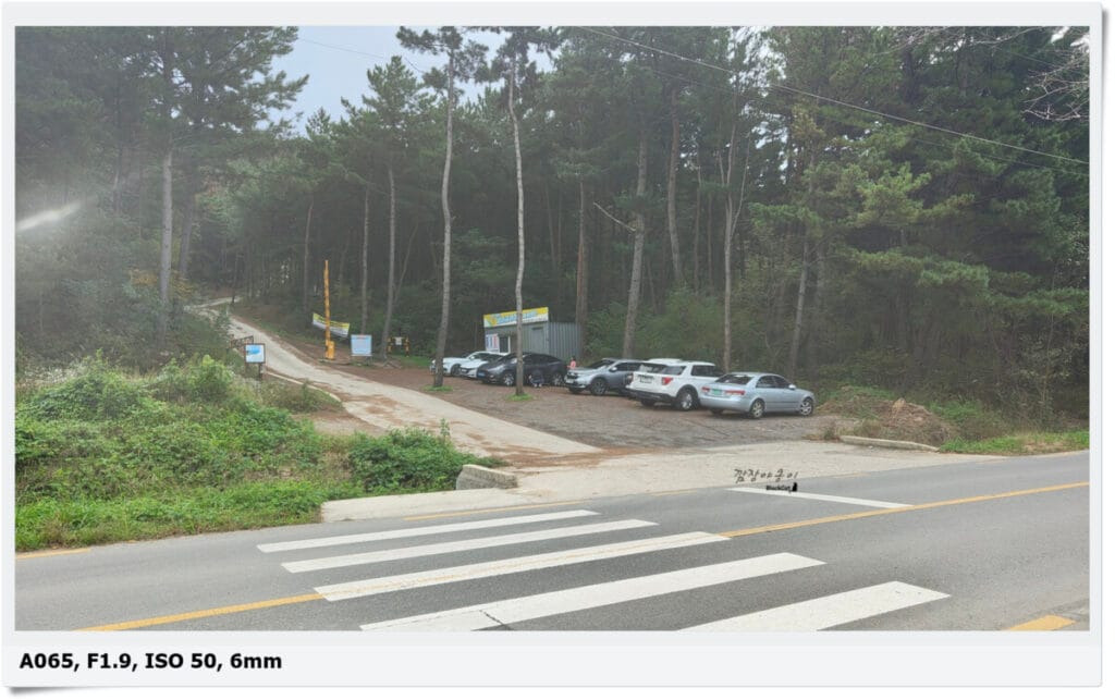 사진으론 경사도가 잘 안보일 수 있을텐데 경사도가 좀 있습니다. 주차장 앞 시작부분과 마지막 끝 부분에 급경사가 있어서 이 두곳만 잘 지나시면 크게 힘들지 않으며 패러글라이딩을 위한 차량이 운행하는 곳이라 바닥은 시멘트 바닥으로 되어 있답니다.