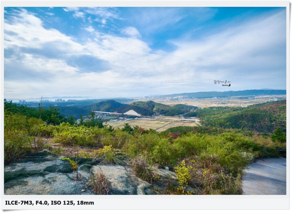 곤륜산 정상에서 바라보면 좌측으론 칠포 마을이, 우측으론 칠포 해수욕장이 있고 정면으론 전망이 탁 트인 바다가 있습니다.