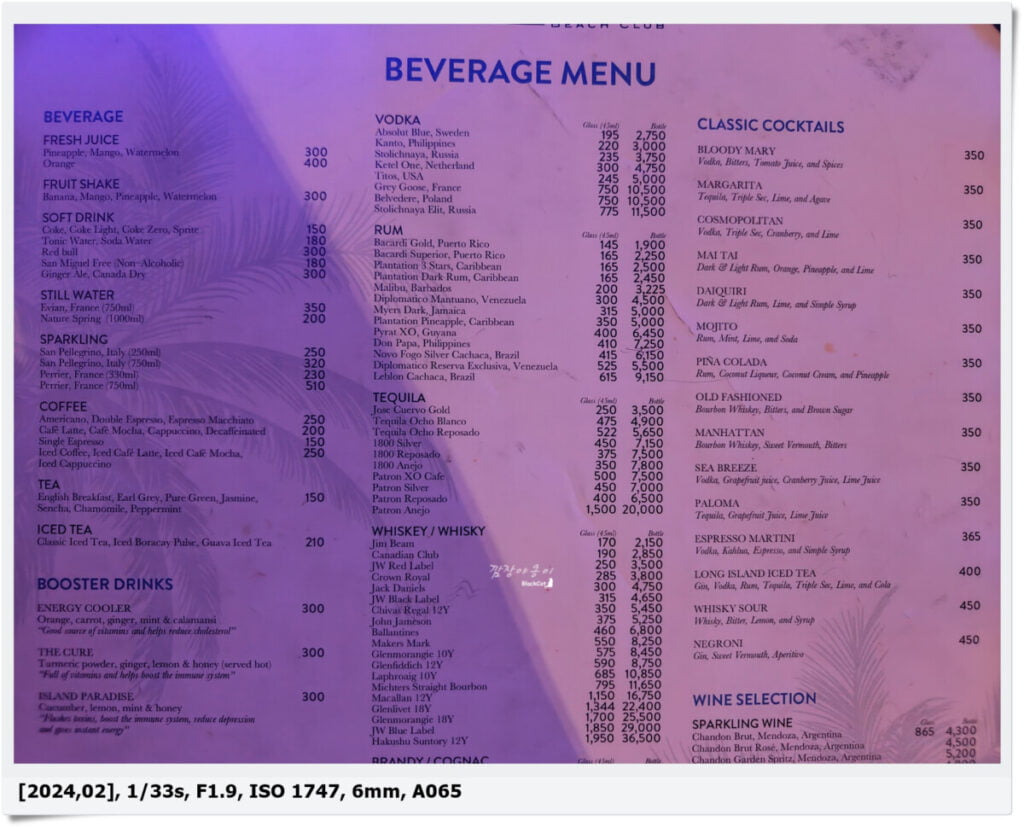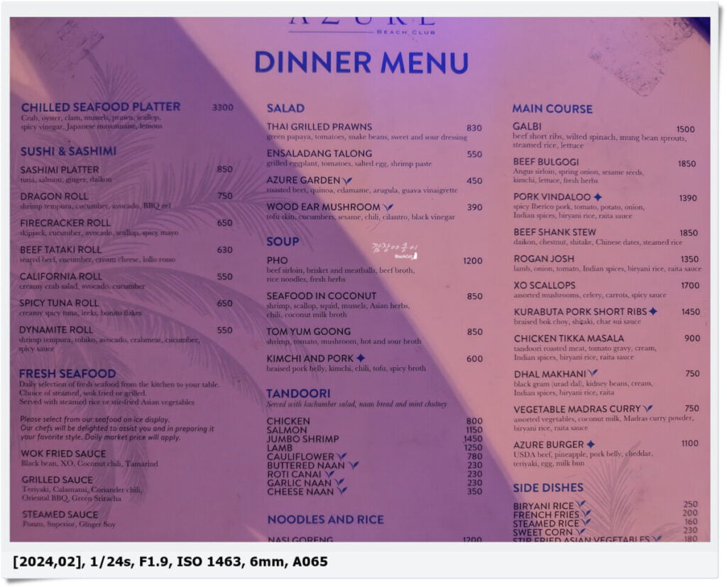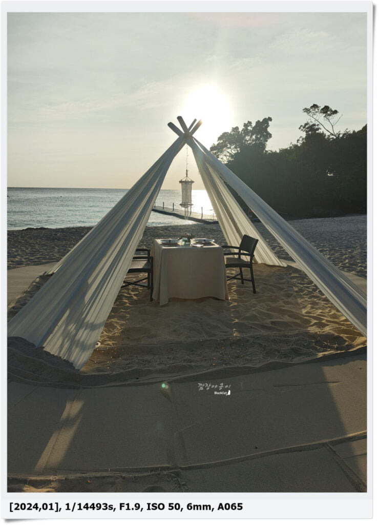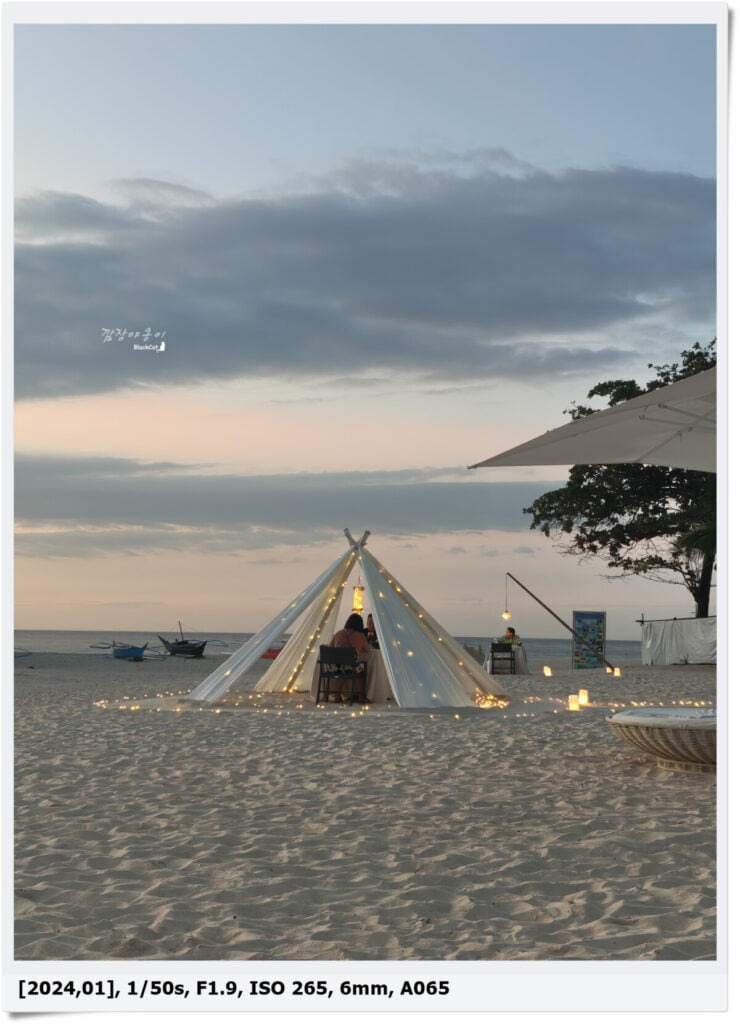 아주레 클럽에 예약을 하면 해변에 예쁜 둘만의 식사텐트를 만들어 줍니다. 가격은 만페소로 대충 한화 25만원 정도 합니다. 로맨틱해 보였는지 와이프도 먹고 싶어했는데,, 로맨틱 디너 자체의 가격만으로 저만큼이니 식사와 음료까지 하면 어마어마하겠죠?