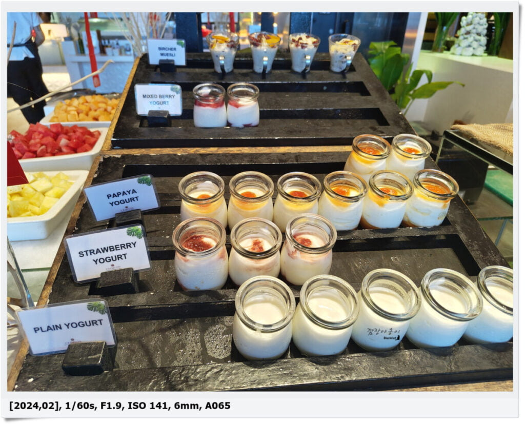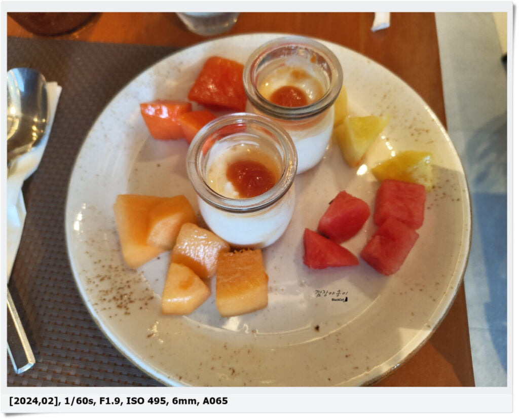 첫번째 날은 짧게 소나기가 와서 내부에서 식사를 했고 두번째 날은 날씨가 좋아 야외에서 조식을 먹었네요. 와이프가 망고를 좋아하는데 조식 메뉴엔 과일 중 망고가 없습니다.
