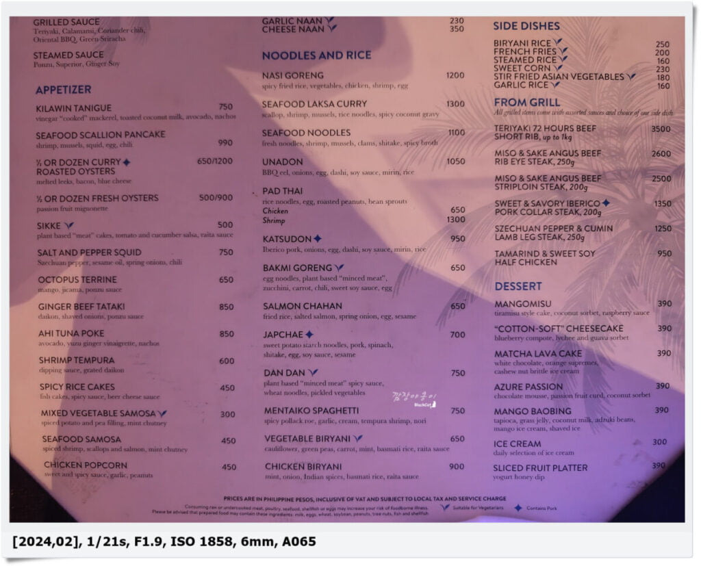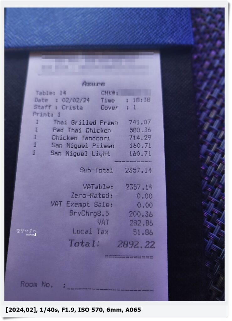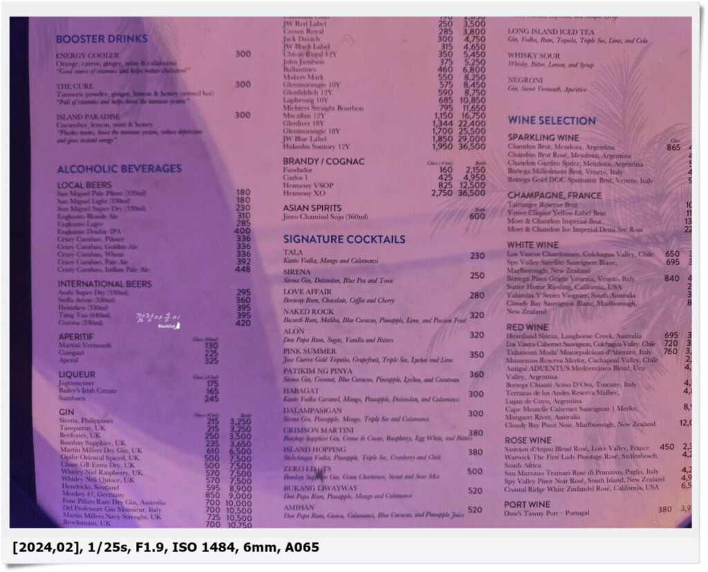 아주레의 메뉴판입니다. 생각보다 너무 메뉴가 많아서 고민이 될 정도랍니다. 2,357페소를 먹었는데 VAT가 283페소에 텍스가 52페소나 붙어서 실제 결제 금액은 확 올라가네요.. 335페소면 한국돈으로 약 8천원 정도입니다. 음료수 한잔값이 부가세라니 ;;