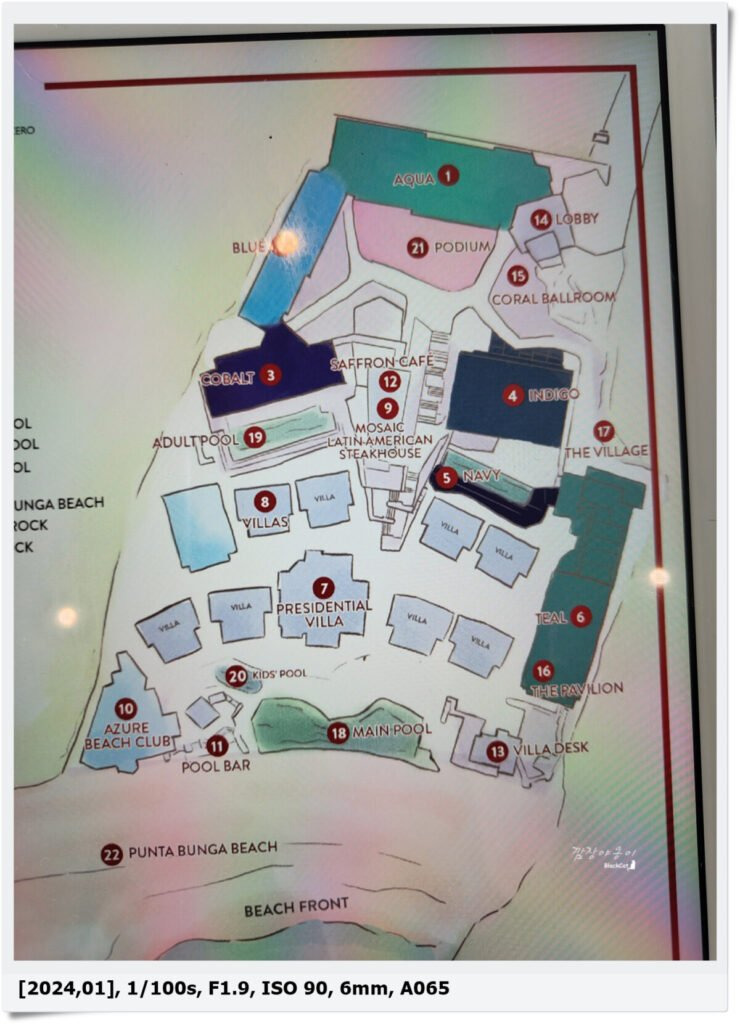 저희가 묵었던 숙소는 위 리조트 내부 지도를 참조하셔서 (3)코발트로 창을 통해 바다를 바로 볼 수 있는 전망 좋은 방이었는데요. (1)아쿠아, (2)블루, (3)코발트, (4)인디고, (6)틸은 빌라처럼 한층에 여러개의 방이 있는 구조로 되어있고 (7), (8)은 독채로 되어 있는 구조입니다.