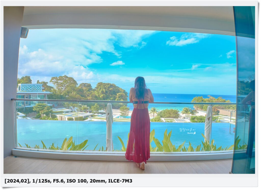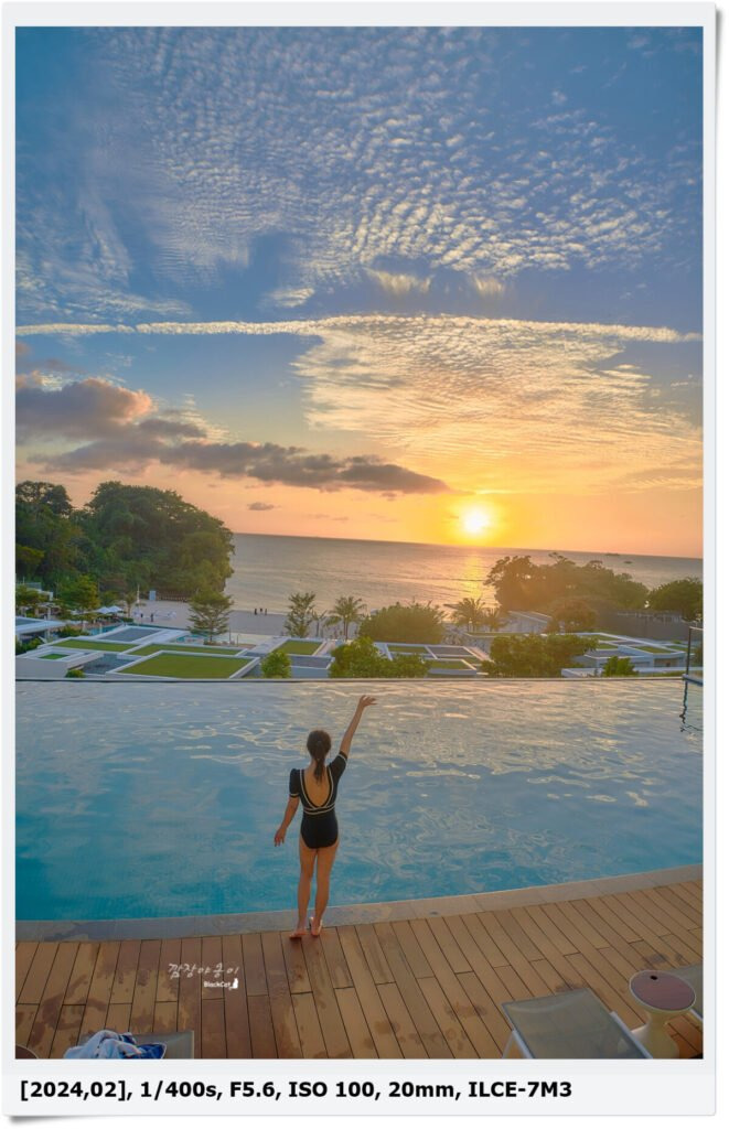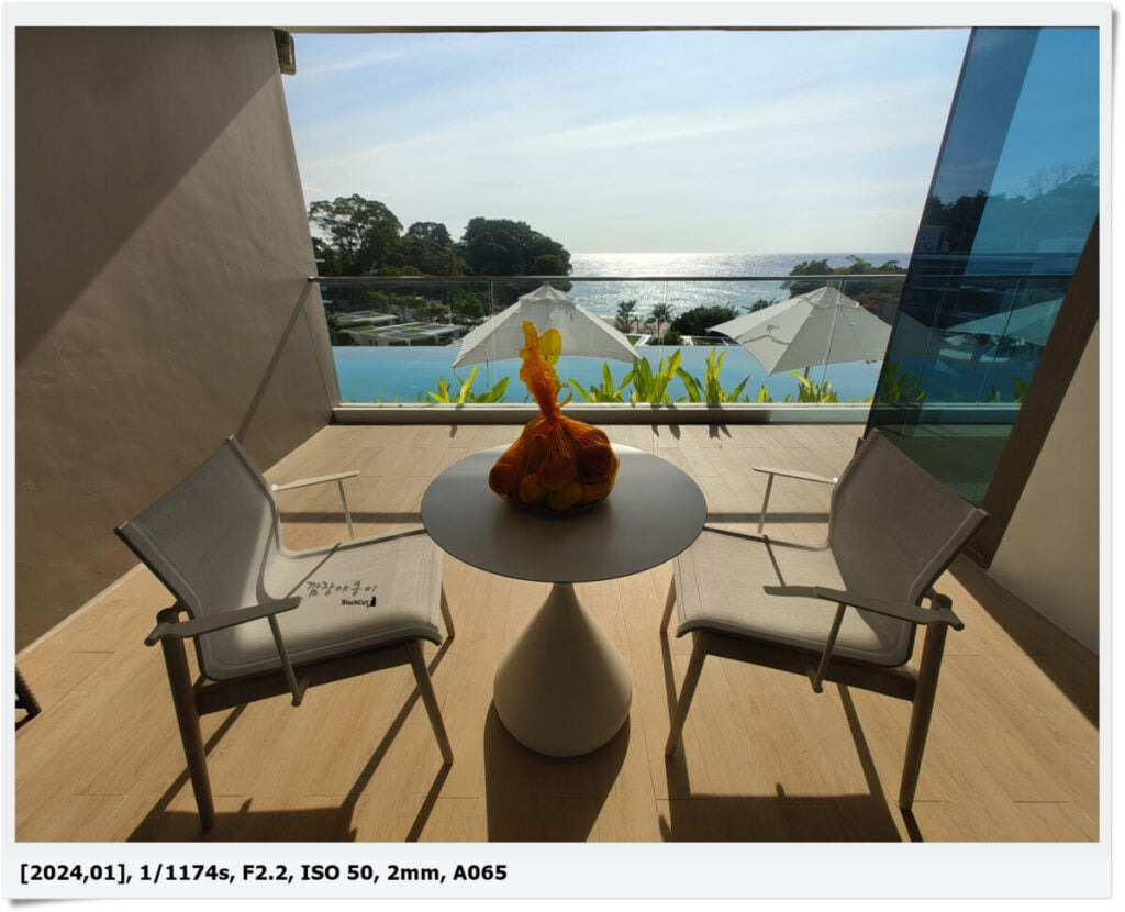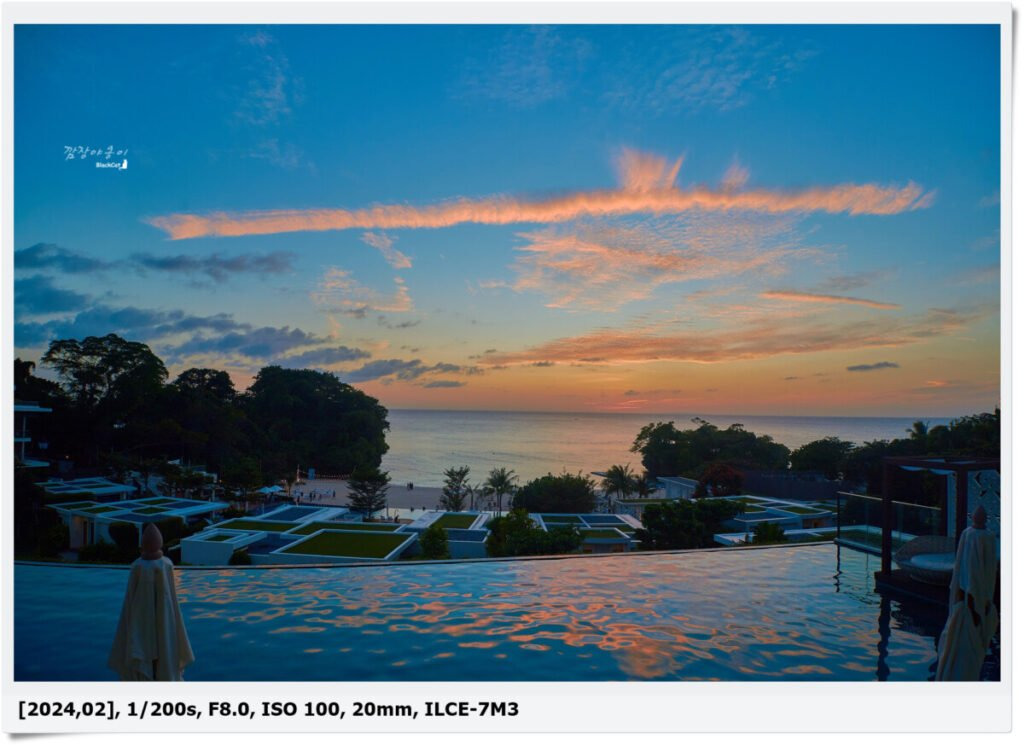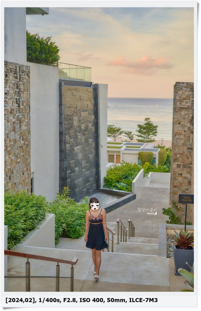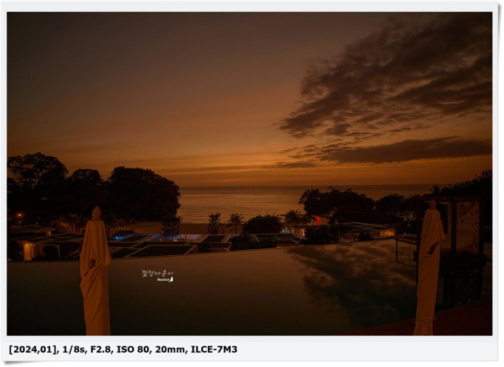 그리고 무엇보다 이 뷰~ 테라스에서 보는 이 뷰가 미쳤지요~ 확실히 돈을 더 주고 바다뷰로 한 보람이 있네요. 이번 여행처럼 숙소에서 많은 시간을 보낼 경우 침대에 누워서 혹은 테라스에 앉아서 보는 뷰 자체로 힐링이 되어야 한다는 와이프론으로 이번 힐링 여행에는 호텔 선택에 심혈을 기울였는데 이 뷰로 모든 게 만족스럽네요. 아침에는 아침대로 푸릇푸릇 반짝이는 색감으로 이쁘고 저녁이야 뭐 말할 것도 없이 이쁜 노을 뷰로 메인 비치에서 본 것보다 예뻤답니다.