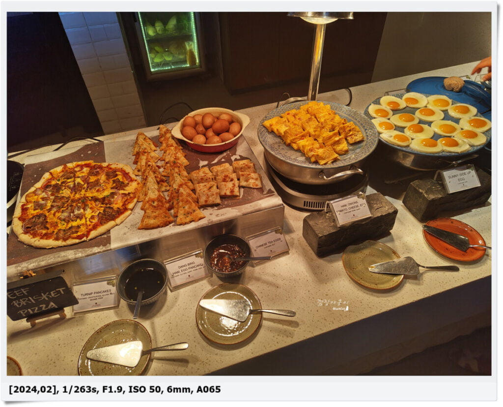 그래도 다 기본은 하고 음식 종류도 꽤 많았답니다. 베이커리, 요거트, 누들바, 에그스테이션, 과일, 한식, 메인 오리고기, 피자, 치즈, 콘지까지 다양했네요.