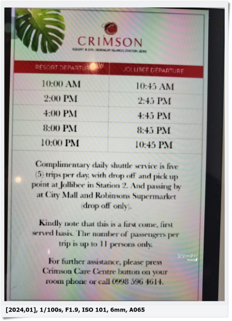 크림슨은 보라카이의 중심가는 아니고 안쪽으로 들어가야 나오는 곳으로 하루 5번 중심지 메인 비치가 있는 졸리비까지 셔틀을 운행하고 있습니다.
