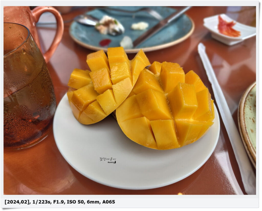 혹시나 해서 직원에게 물어봤지만 망고가 없다는 답변을 받아 과일을 먹지 못했었는데 둘째날엔 전날 우리에게 과일을 골라주던 좀 급이 높아 보이는 직원에게 물어봤더니 망고 하나를 구해와 잘라주시네요~
