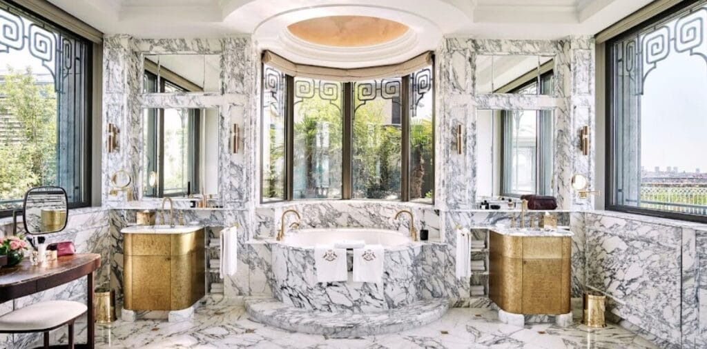 일부 스위트룸에선 에펠탑 조망이 가능하며 고급스러운 스파와 수영장 시설을 가지고 있으며 내부에 미슐랭 3스타 레스토랑이 있어 멋진 만찬을 즐길 수 있습니다. 세계적으로 유명한 플로리스트 Jeff Leatham이 디자인한 화려한 꽃 장식과 로비 라운지에서 정기적으로 라이브 피아노 공연과 예술 전시회 등을 개최하고 있습니다. 고객 맞춤 서비스로 에펠탑 VIP투어도 있다고 하네요.