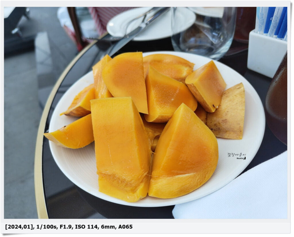 여전히 이 호텔도 망고는 비치되어 있지 않고 과일 코너 직원에게 요청하면 몇명이냐고 물어보고 깊숙한 곳에서 꺼내서 잘라주네요. 산지 특산물이라고 해도 망고가 확실히 비싸긴 한가 봅니다.