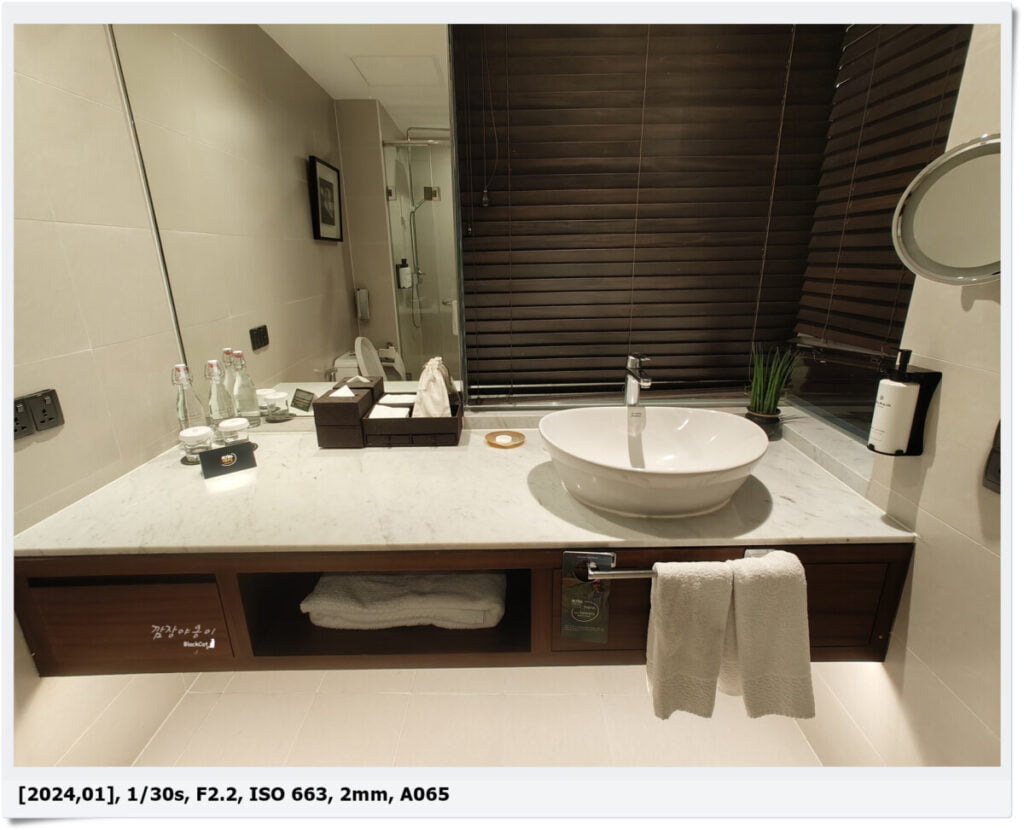 특이하게 물이 화장실에 세팅되어 있는 건 왜... 보통 티비 근처나 테이블 위에 있을텐데 여긴 화장실에 물을 비치해 뒀네요. 양치용은 아닐텐데 ;; 나라마다 방식이 다르니 다른 특이점이 있어서 화장실에 비치해 둔건지는 잘 모르겠네요.