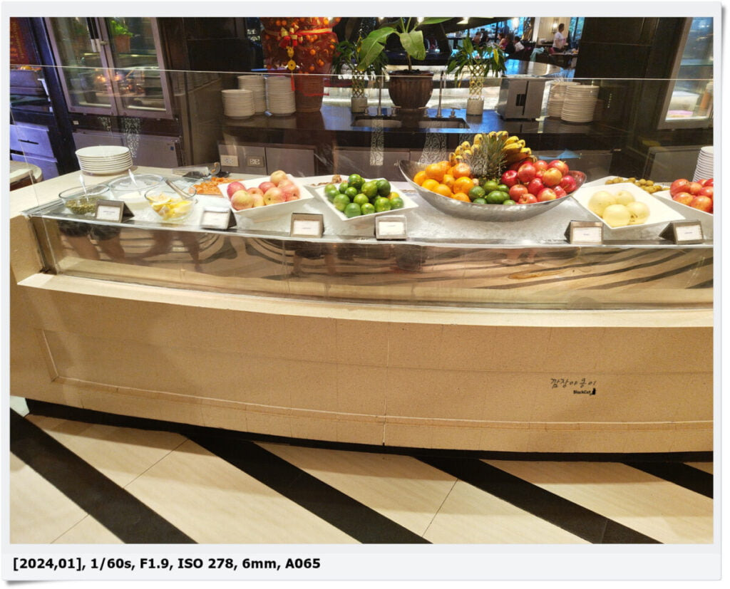 일일이 종류를 다 열거하기 힘들 정도로 많은데요. 여전히 가장 인기가 많은 건 에그스테이션이랍니다. 원하는 메뉴를 즉석에서 만들다 보니 어마어마한 투숙객에 비해 두 군데에서 4명의 요리사가 만들고 있음에도 웨이팅이 어마어마해서 한 번밖에 먹지 못했네요. 와이프의 호텔 조식 최애 메뉴가 금방 만든 오믈렛과 망고인데,,,