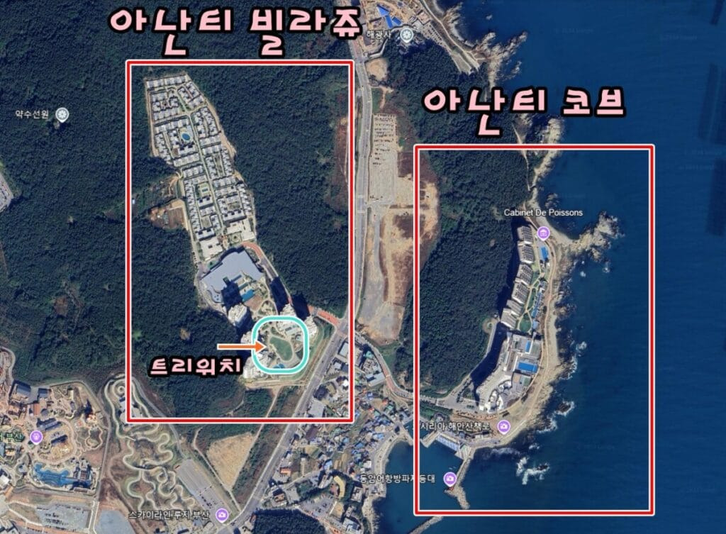 오른쪽 바닷가쪽은 기존에 있던 아난티 코브이고 왼쪽이 생긴지 얼마 안된 아난티 빌라쥬로 우리의 목적지는 이곳에 있습니다.
