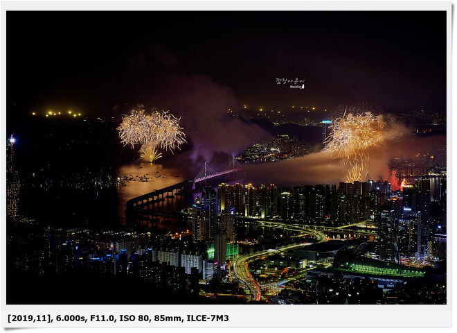 현재 5년째 쓰고 있는 소니 A7M3로 촬영한 사진으로 광안리 불꽃축제가 있는 곳에서 많이 떨어진 곳이라 85mm 렌즈 하나만 가지고 갔었는데 충분했답니다.