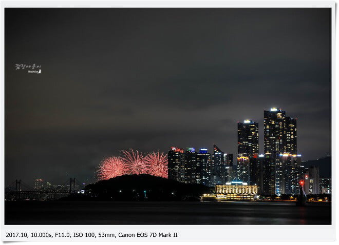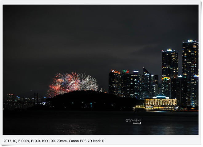 약간 떨어져 있긴 하지만 동백섬과 조선비치 호텔을 프레임에 담아 불꽃과 함께 촬영할 수 있는 곳으로 조용한 곳을 찾는 분에게 추천 할 수 있는 장소랍니다.