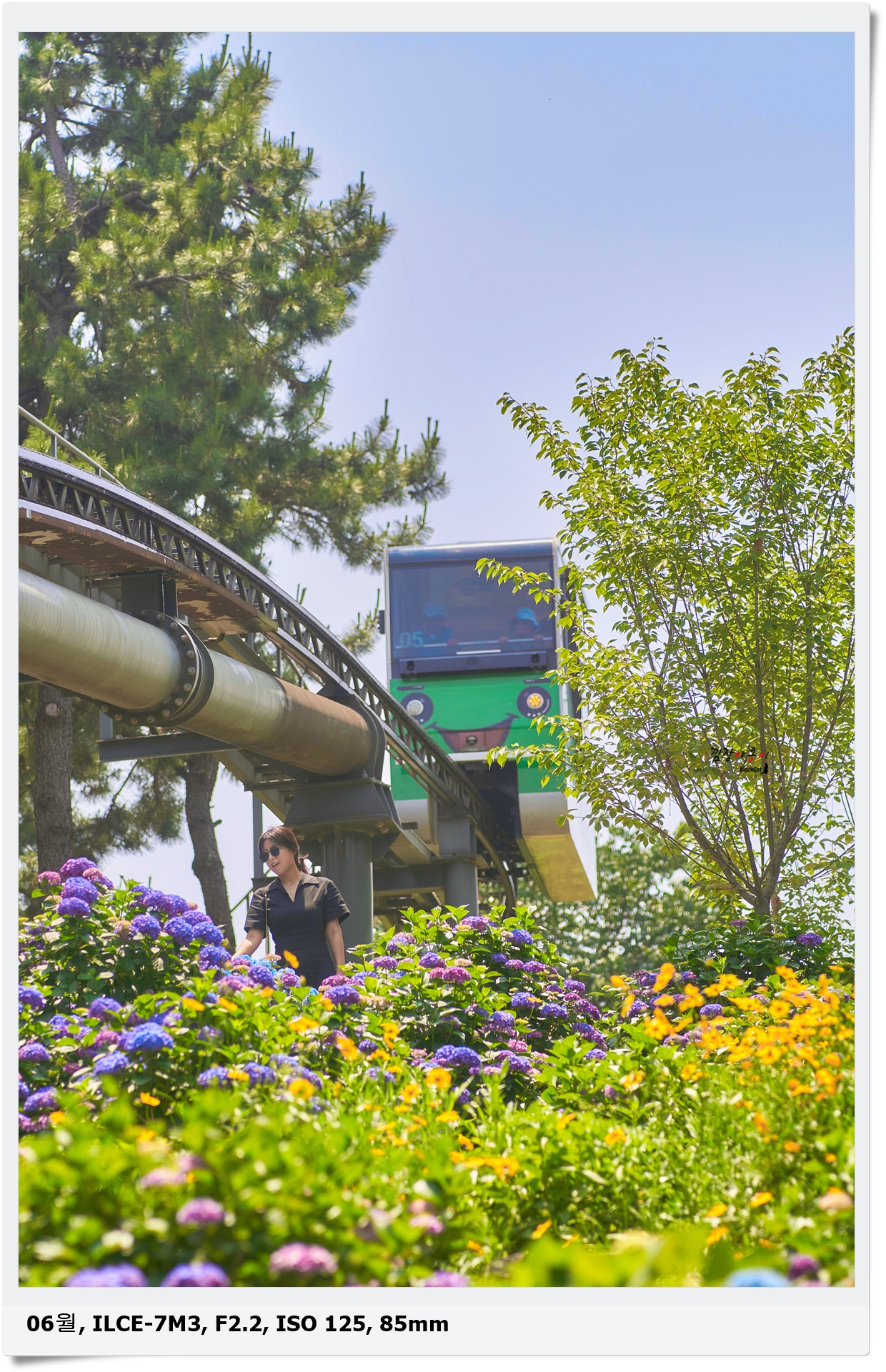 모노레일이 올때 찍어본 사진이랍니다. 일몰때 오시면 붉게 물든 하늘로 더 예쁜 사진을 담을 수 있을거 같네요. 모노레일 지나갈때 모노레일/ 수국/ 와이프를 한 프레임에 담으려고 고생을 좀 했네요 ㅎ