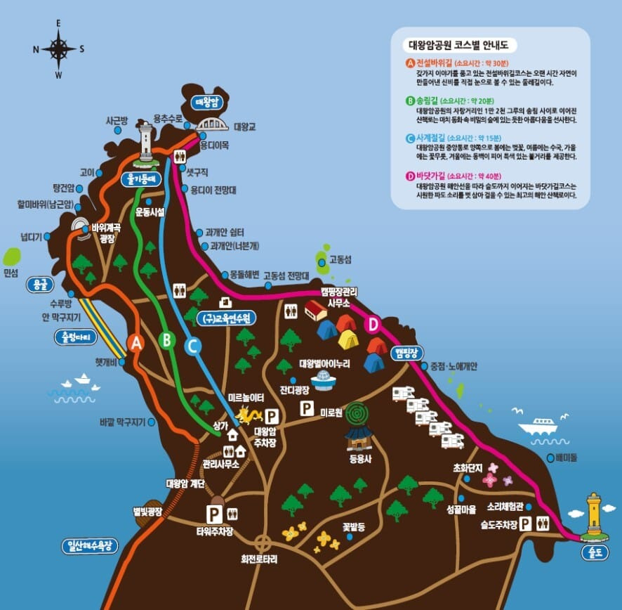 울산 12경 중 한곳으로 30분 코스인 전설바위길, 20분 코스인 송림길, 15분 코스인 사계절길, 40분 코스인 바닷가길까지 총 4개의 둘레길 코스가 있습니다.