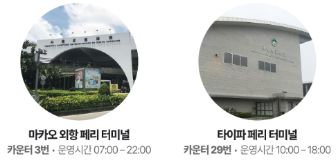 - 홍콩(Shun Tak Centre / Hong Kong International Airport Skypier) → 마카오(Outer Harbour / Taipa Ferry Terminal)