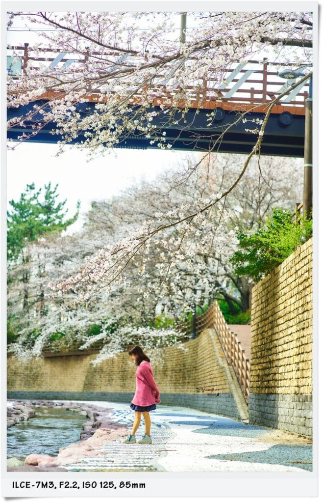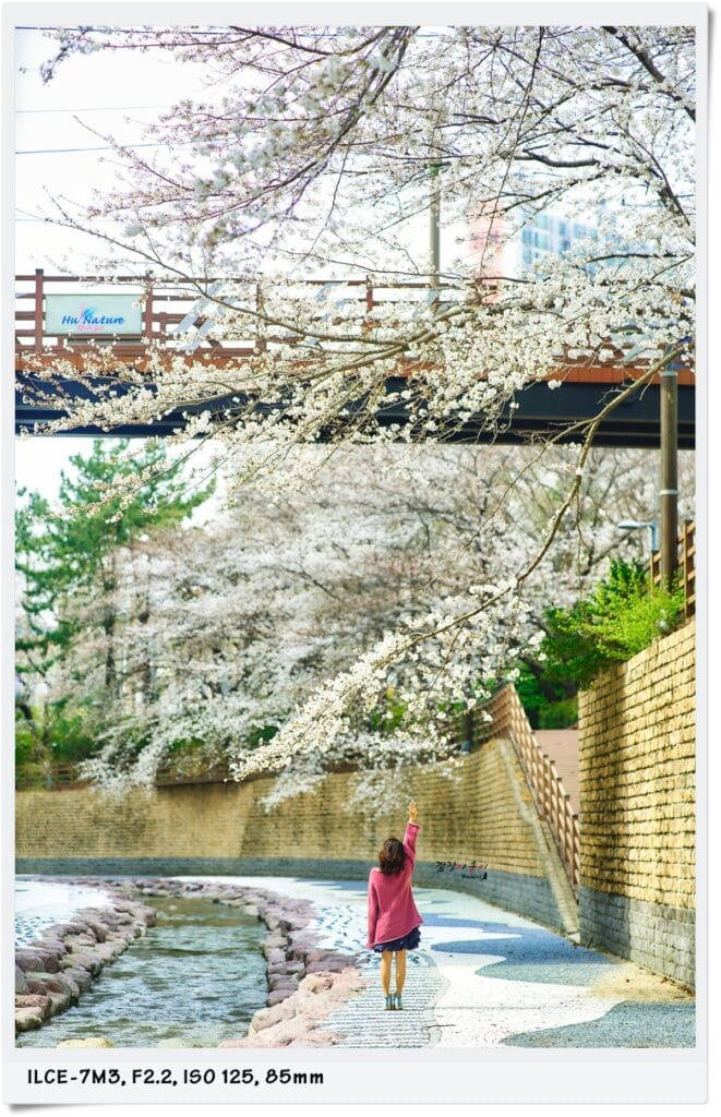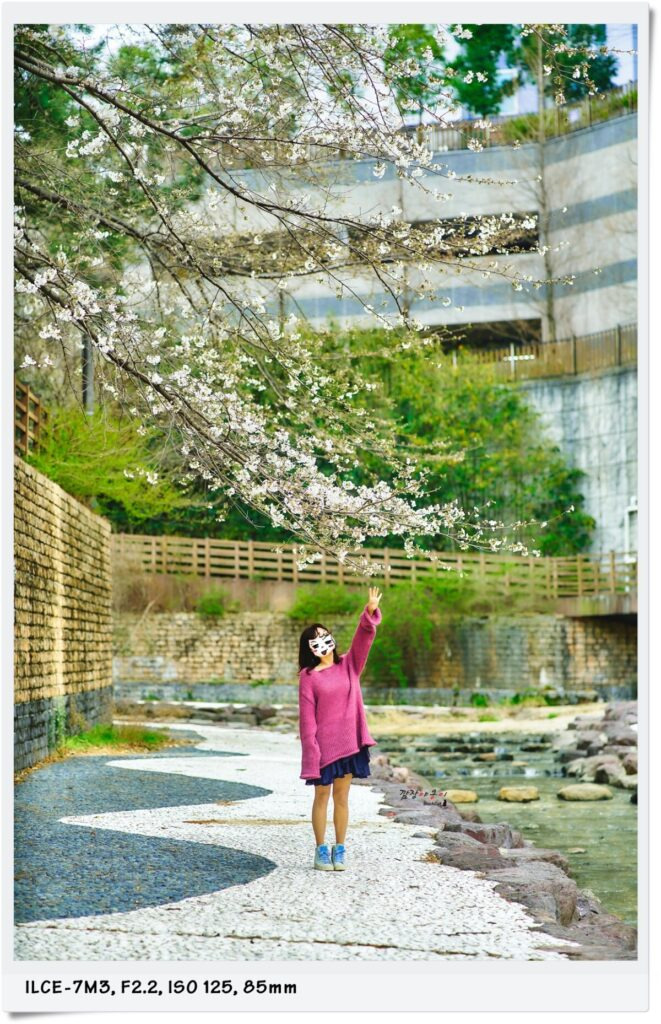 수양 벚꽃은 아니지만 시냇물이 흐르는 아래로 축 쳐진 벚나무 가지를 배경으로 하천으로 내려가 사진을 찍어봤는데요.