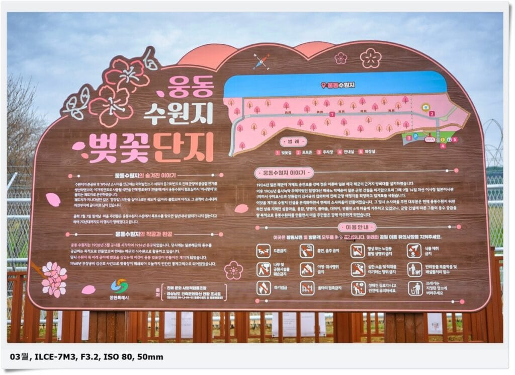 웅동수원지 벚꽃은 일반인들에게 공개를 위해 기존의 노후 철책을 일부 허물오 펜스 설치 및 화장실, 포토존 조성 등 관광객을 맞이할 준비를 마쳤고 지난 3월 중순에 일반인에게 공개가 되었습니다. 4월 중순까지만 공개를 한다고 하니 앞으로 남은게 채 일주일 정도 밖에 되지 않네요.