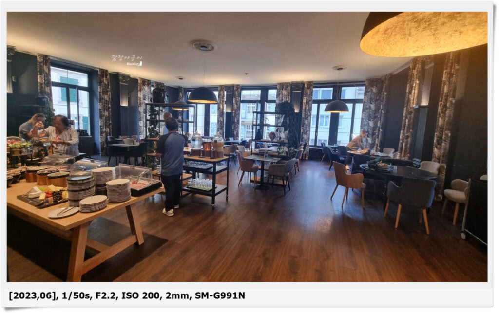 저희는 조식이 포함되어 있었으며 '더 헤이 호텔'의 조식은 아침 6시30분부터 9시까지 드실 수 있고 특이하게 1.5층에 식당이 있어 로비층에서 계단으로 올라가시던지 2층에서 반층을 걸어 내려오시던지 해야 합니다.