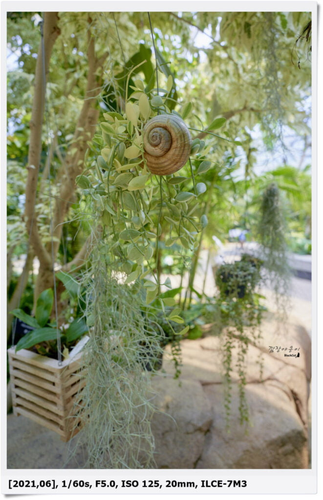 그리고 이름은 모르겠는데 벤자민 나무에 달려있었는데요. 저걸 암모나이트라고 해야 할지 달팽이 껍데기라고 해야할지.. 무지 큰 달팽이 모양의 장식품에서 머리카락 같이 생긴 식물들도 막 자라고 있네요.