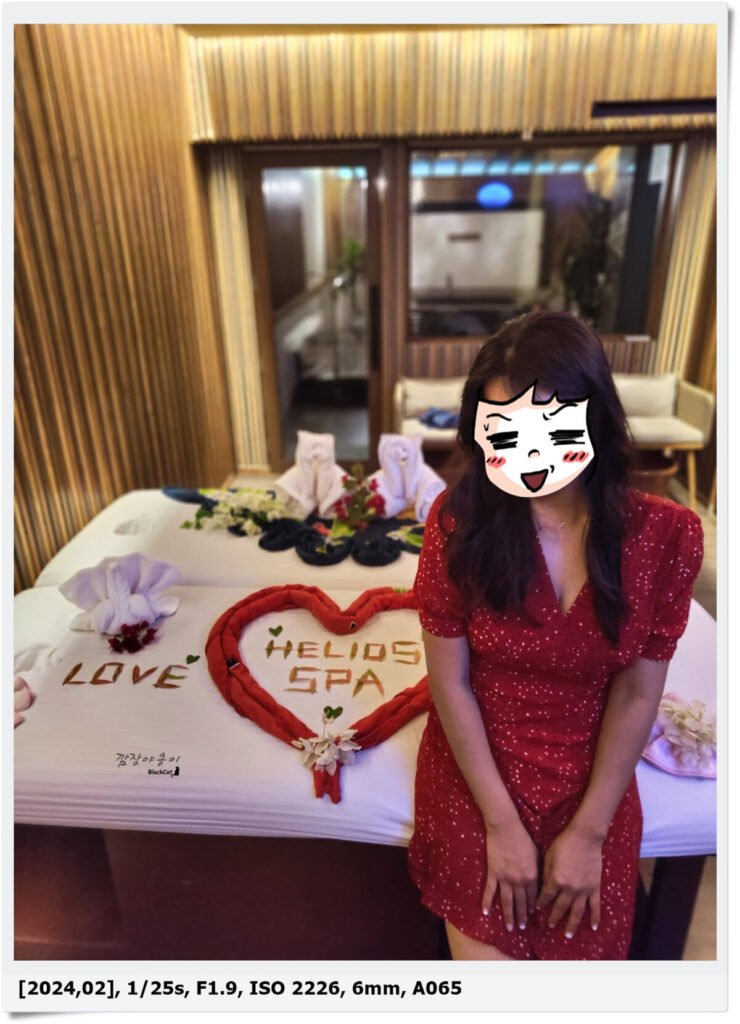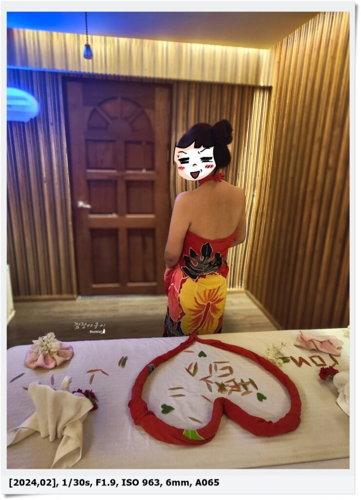 본격적인 스크럽과 마사지에 들어가기 전에 침대 위 장식들이 흐트러지기 전 사진도 찍으면서 잠시 시간을 보냈네요.