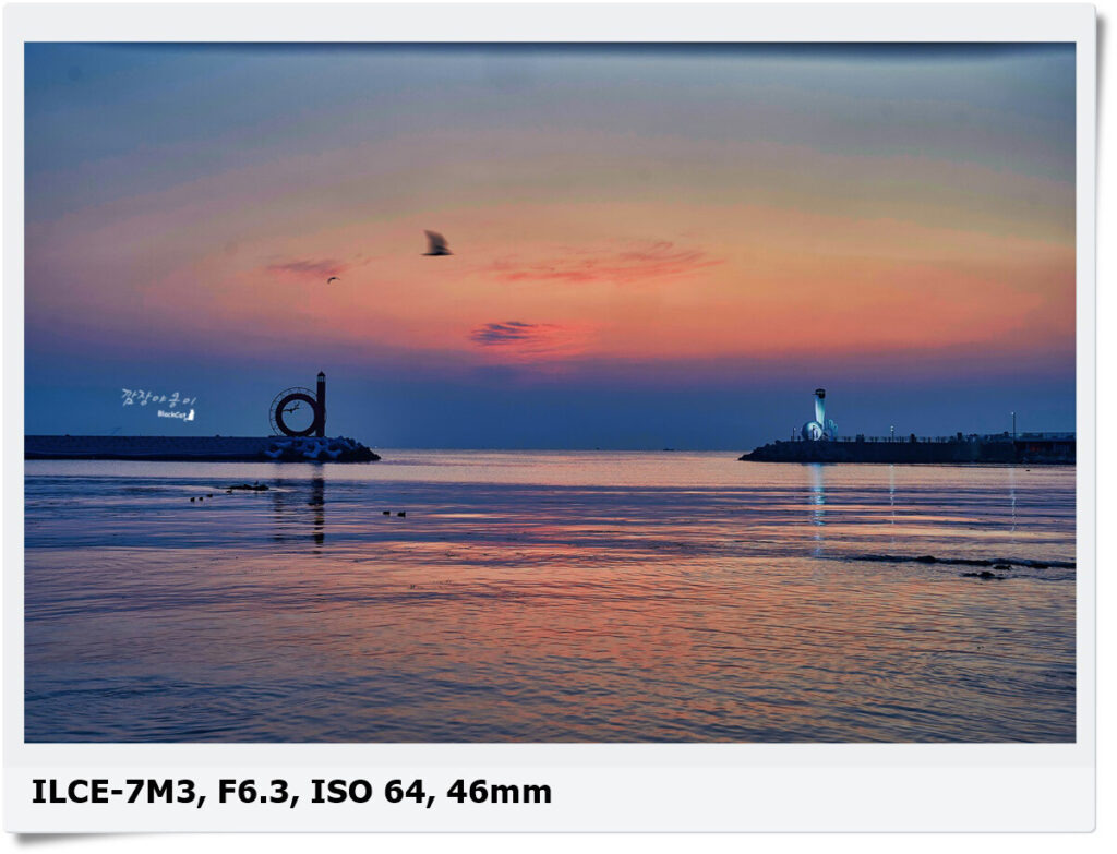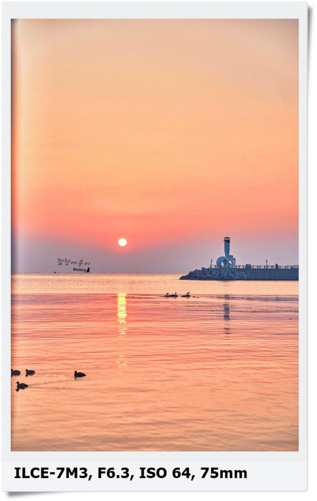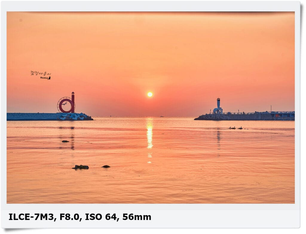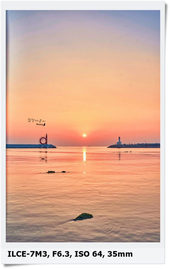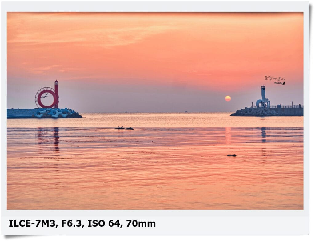 갈매기등대와 야구등대 사이에 떠 오르는 태양을 촬영하기 위해선 대충 풀프레임 기준 50mm 내외의 렌즈 하나만 있어도 가능한데, 50mm로 가로는 두개의 등대를 모두 담을 수 있지만 세로로 촬영하면 짤려서 세로로 촬영하실분은 35mm 내외 렌즈도 하나 있으셔야 합니다.