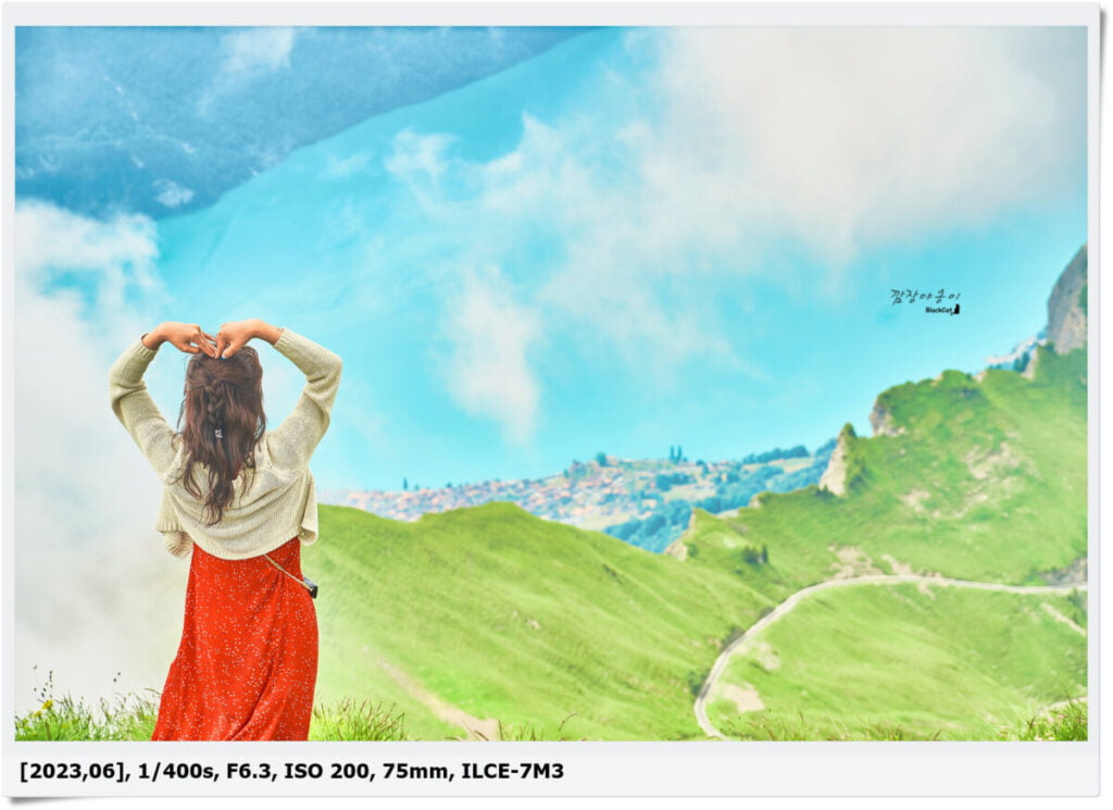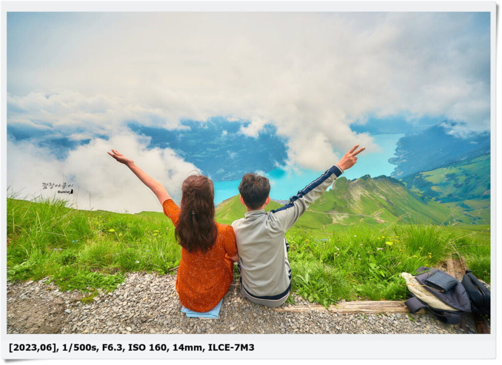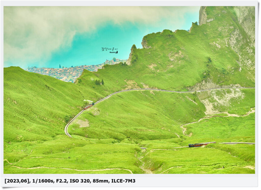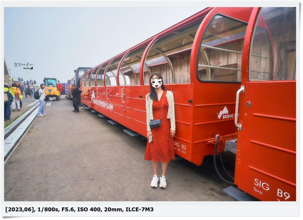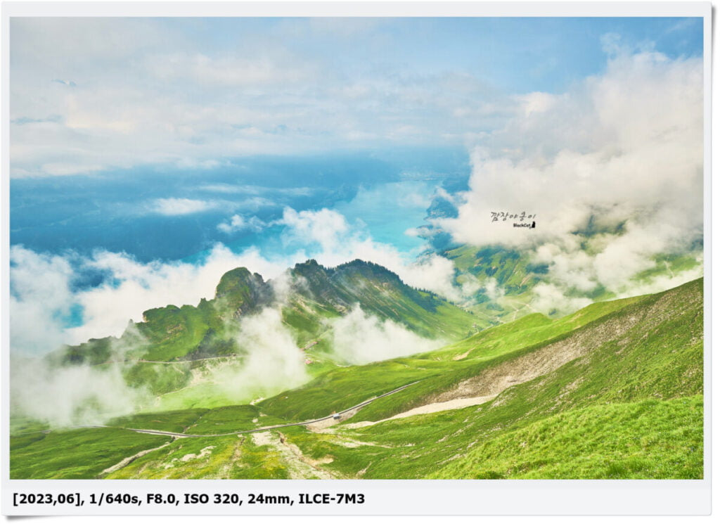 구름이 너무 많아 아쉽기도 했지만 또 구름이 많아 색다른 사진이 많이 나와서 좋았네요. 구름에 가려져 맑고 깨끗하고 투명한… 전경은 볼 수 없었지만 구름 사이로 보이는 브리엔츠 호수와 마을, 그리고 하얀 증기를 내뿜으며 이동중인 장난감 같은 빨간 증기기관차까지 짧지만 강렬했던 모습이었네요.