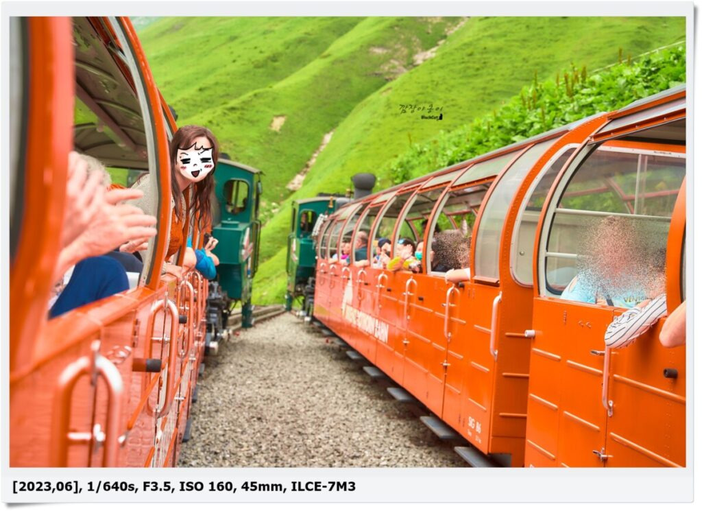 중간에 올라가는 산악기차 내려가는 산악기차가 서로 크로스 하는 곳에선 직원이 내려서 기차 레일을 변경하는 모습도 있고 두대의 기차가 스쳐 지나가는 순간에는 서로 반갑게 인사도 나누곤 했답니다 ㅎ